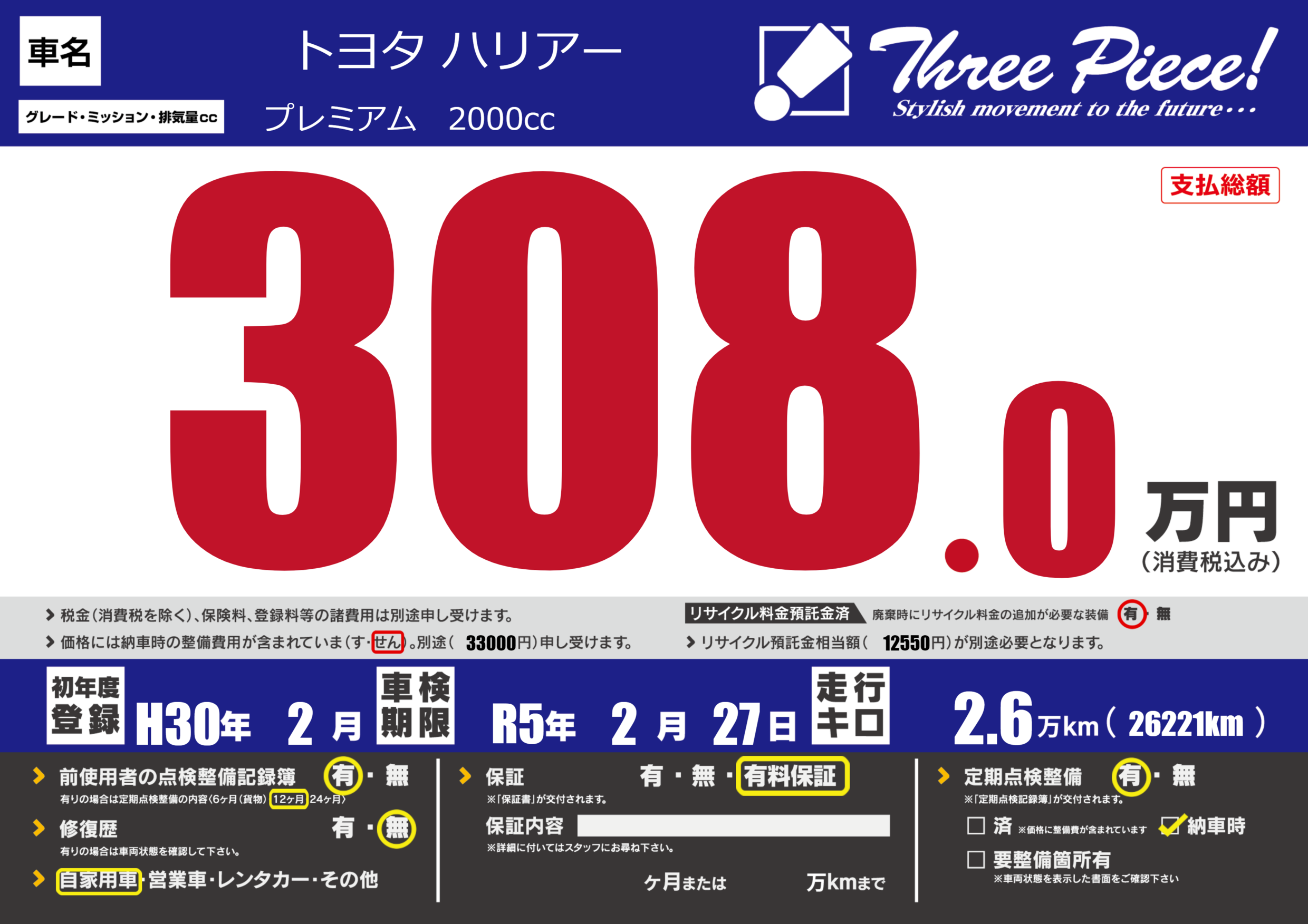 | 車名 | トヨタ ハリアー | グレード ミッション 排気量 |