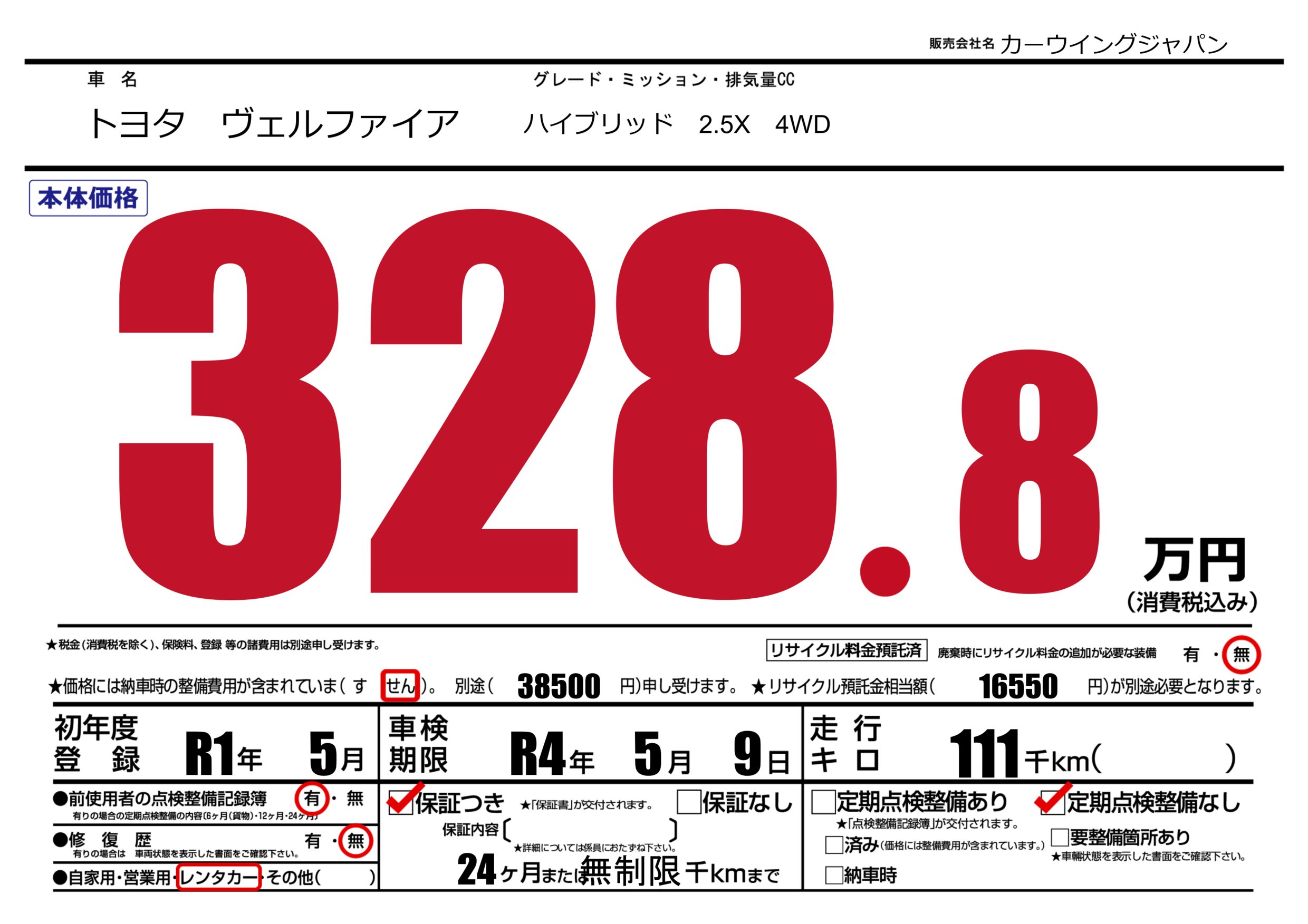 | 車名 | トヨタ ヴェルファイア | グレード ミッション 排気量 |
