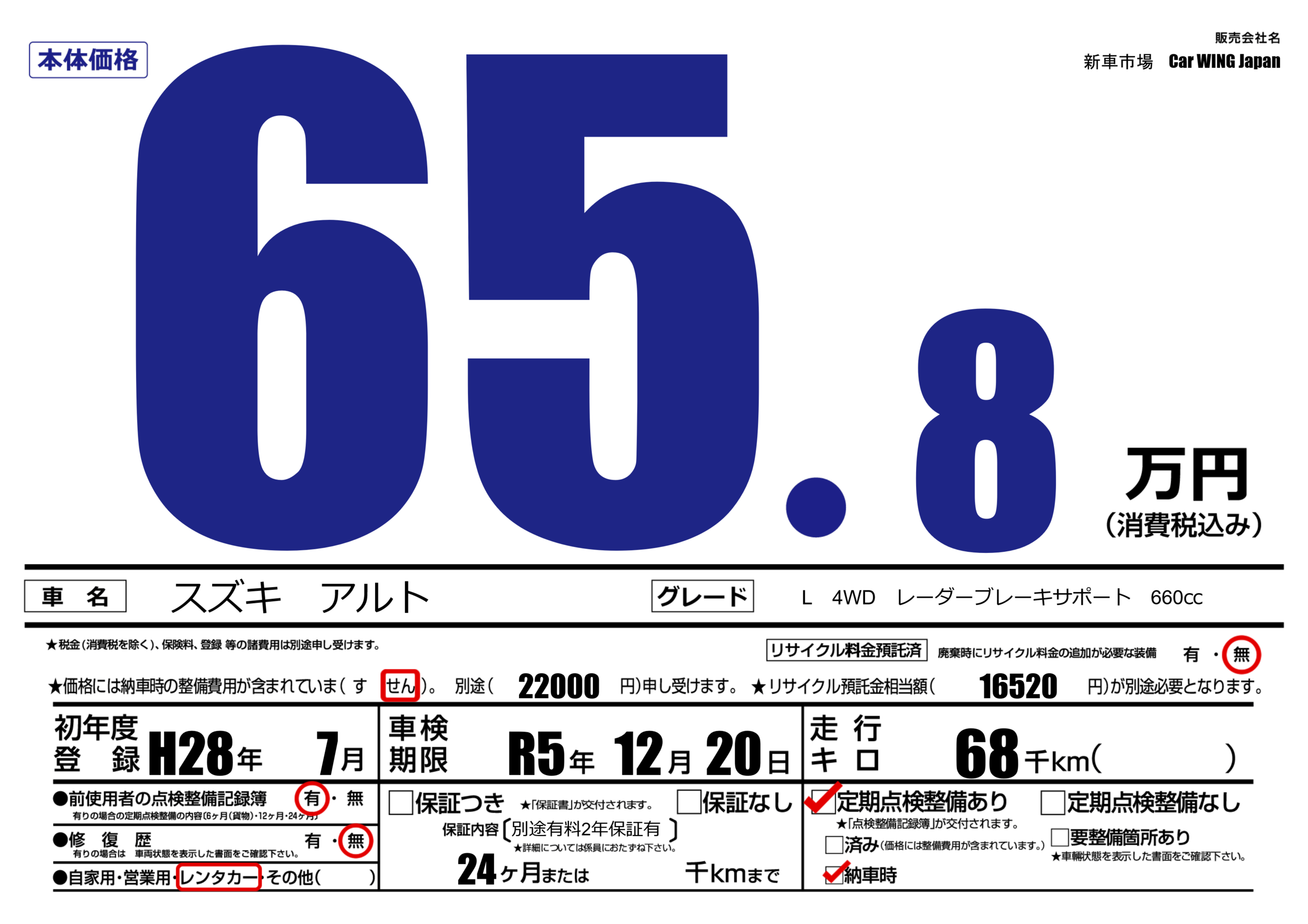 | 定期点検整備 | 定期点検整備あり 納車時あり | ||