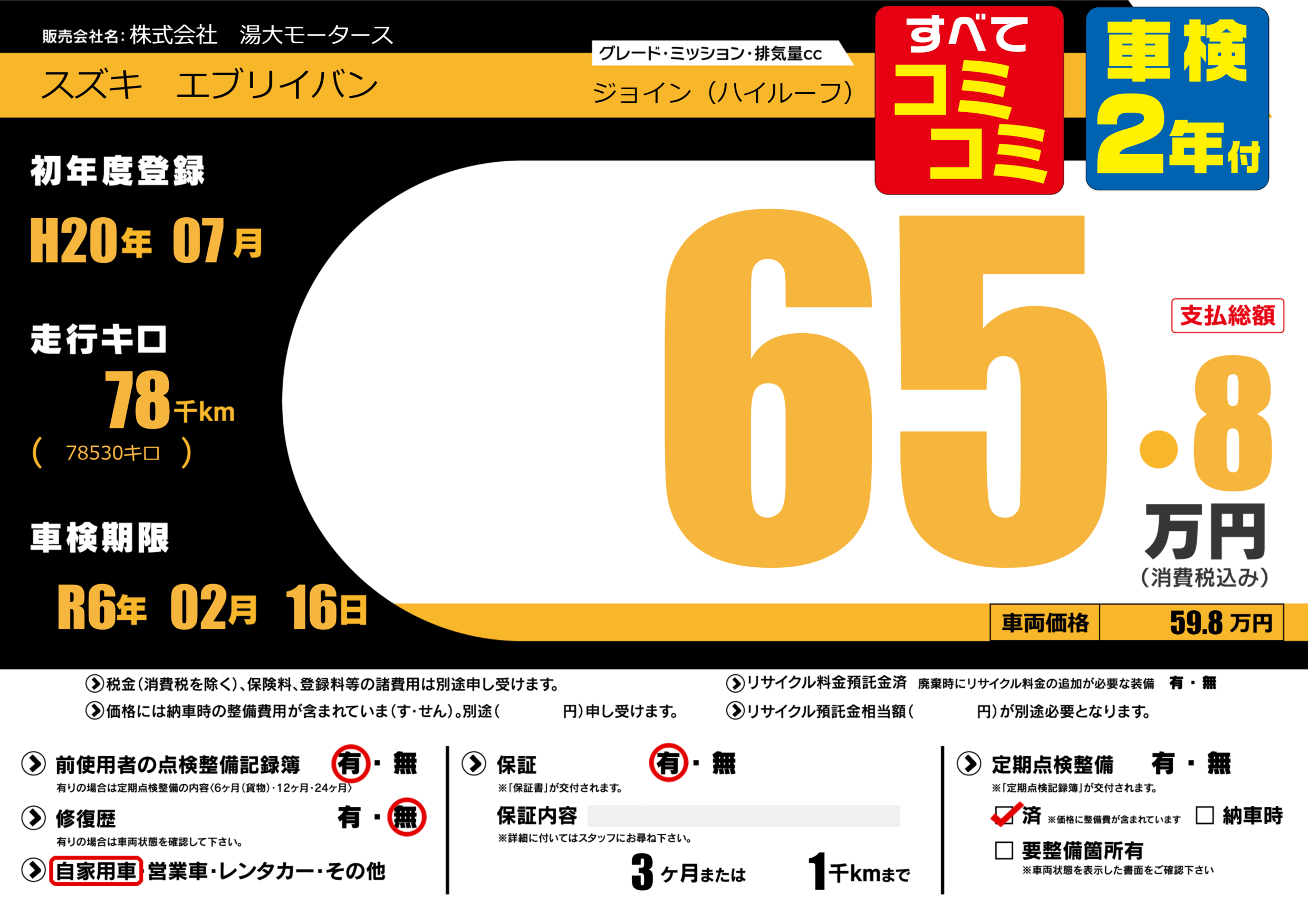 | 車名 | スズキ エブリイバン | グレード ミッション 排気量 |