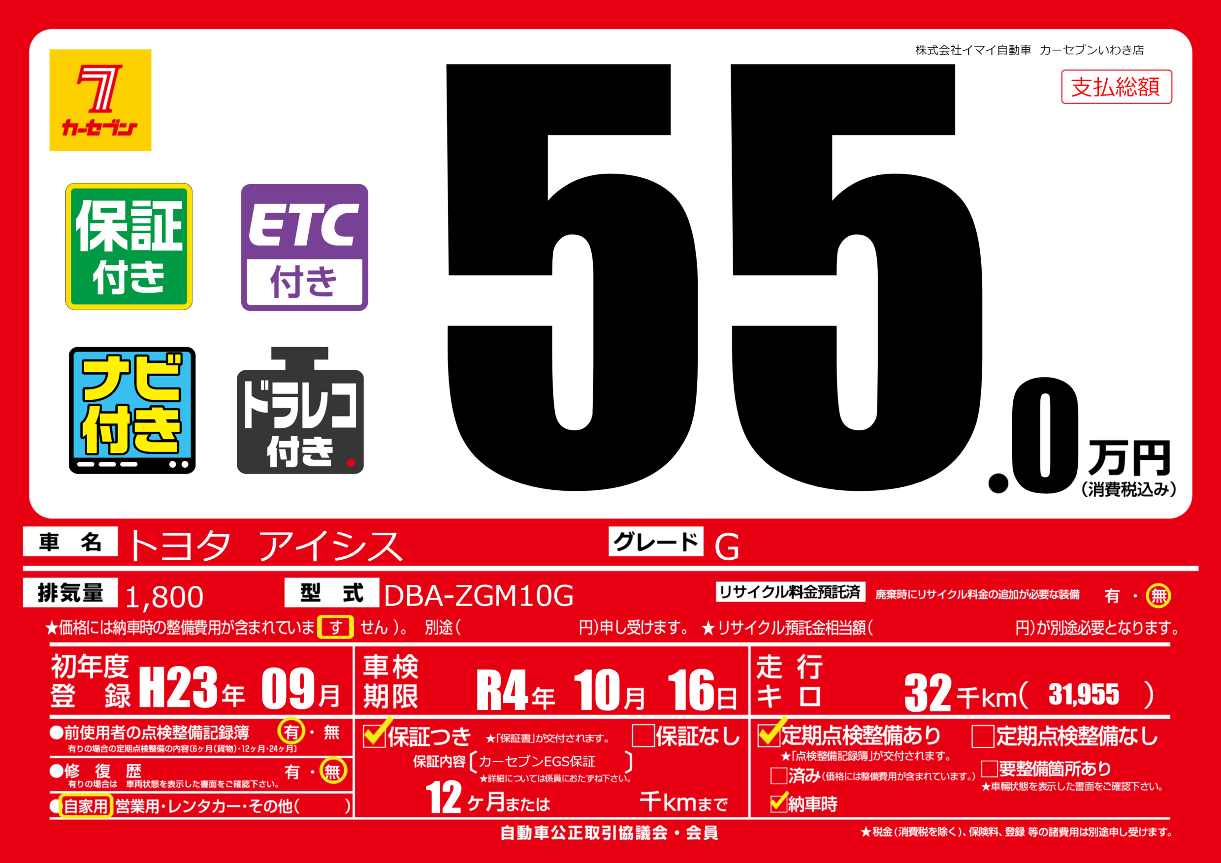 | 車名 | トヨタ アイシス | グレード ミッション 排気量 |