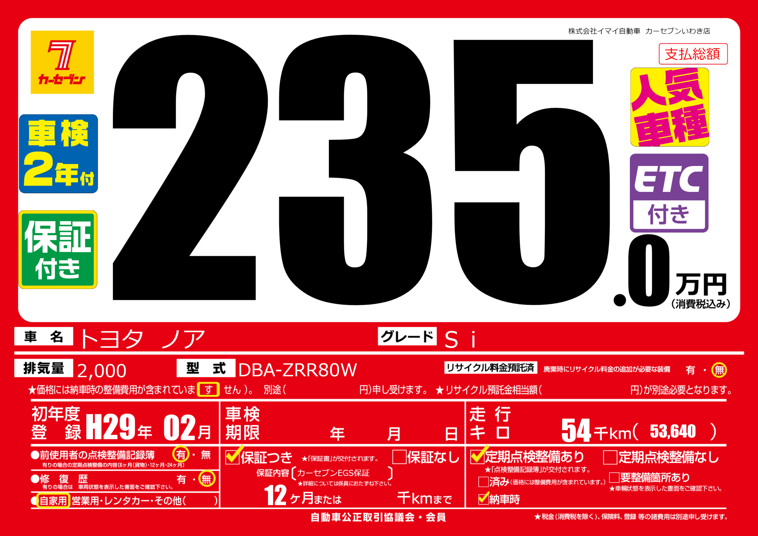 | 車名 | トヨタ ノア | グレード ミッション 排気量 |