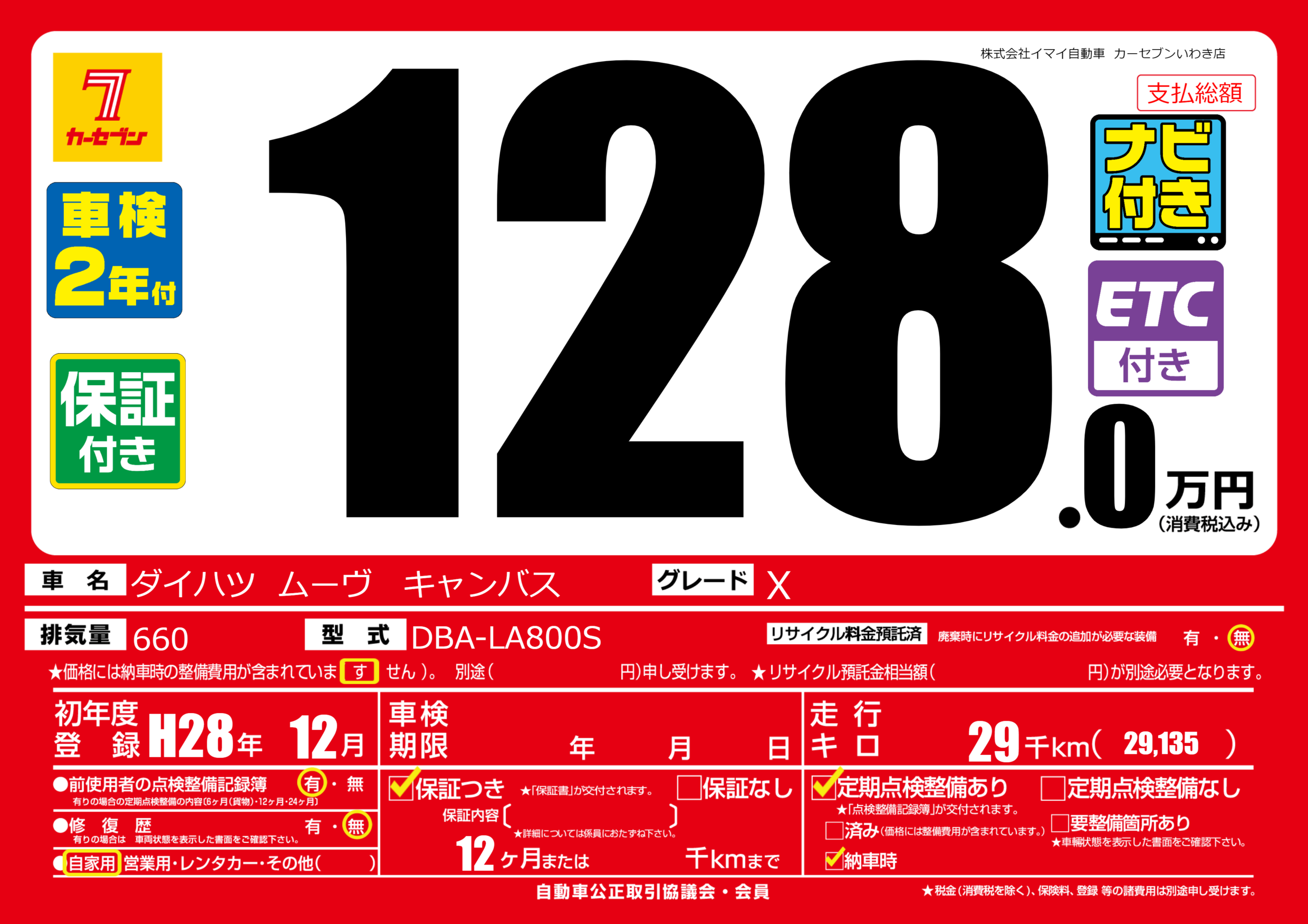 | 走行キロ | 2.9万km | 初年度登録 | H28年12月 |