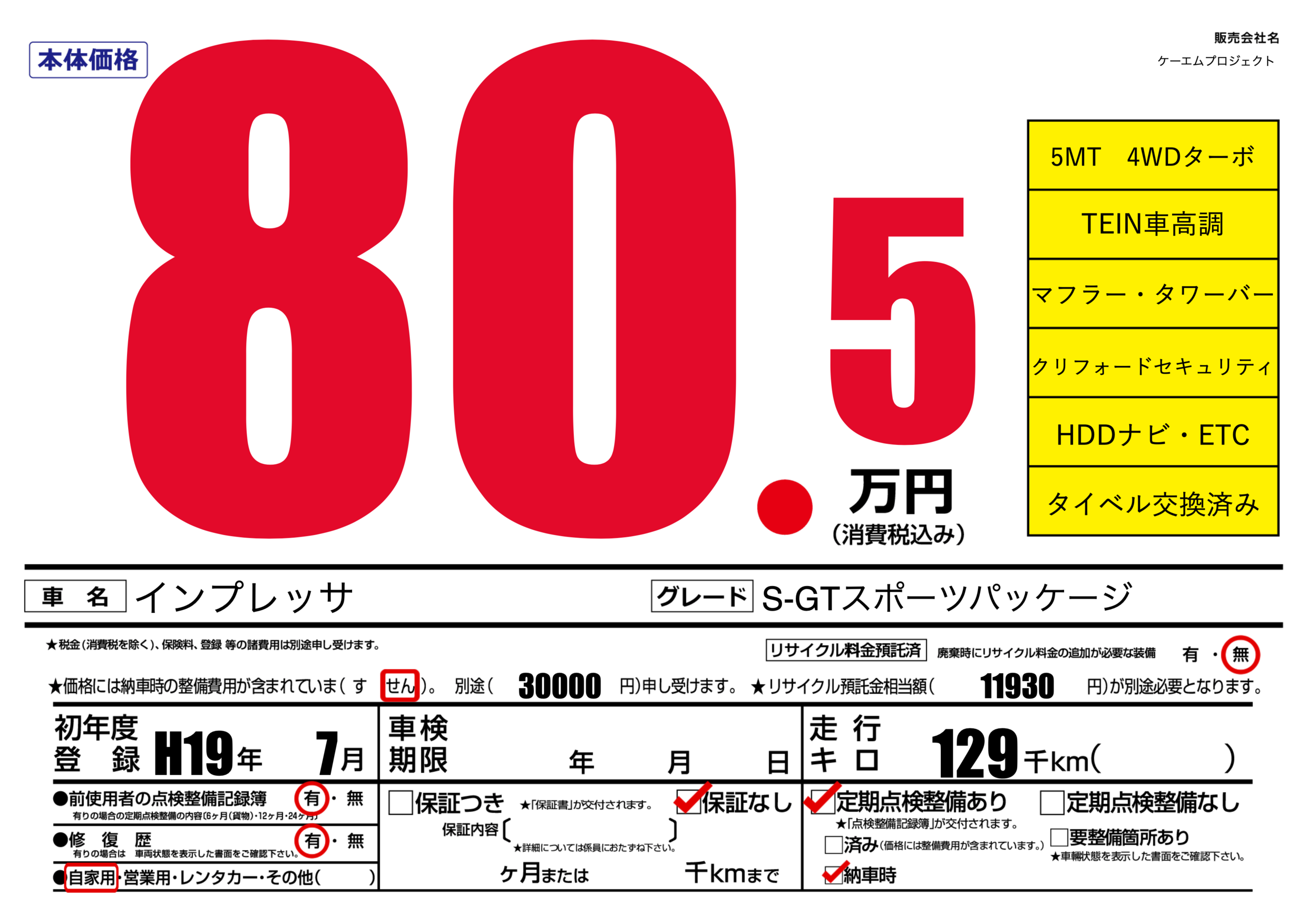 | 車名 | インプレッサ | グレード ミッション 排気量 |