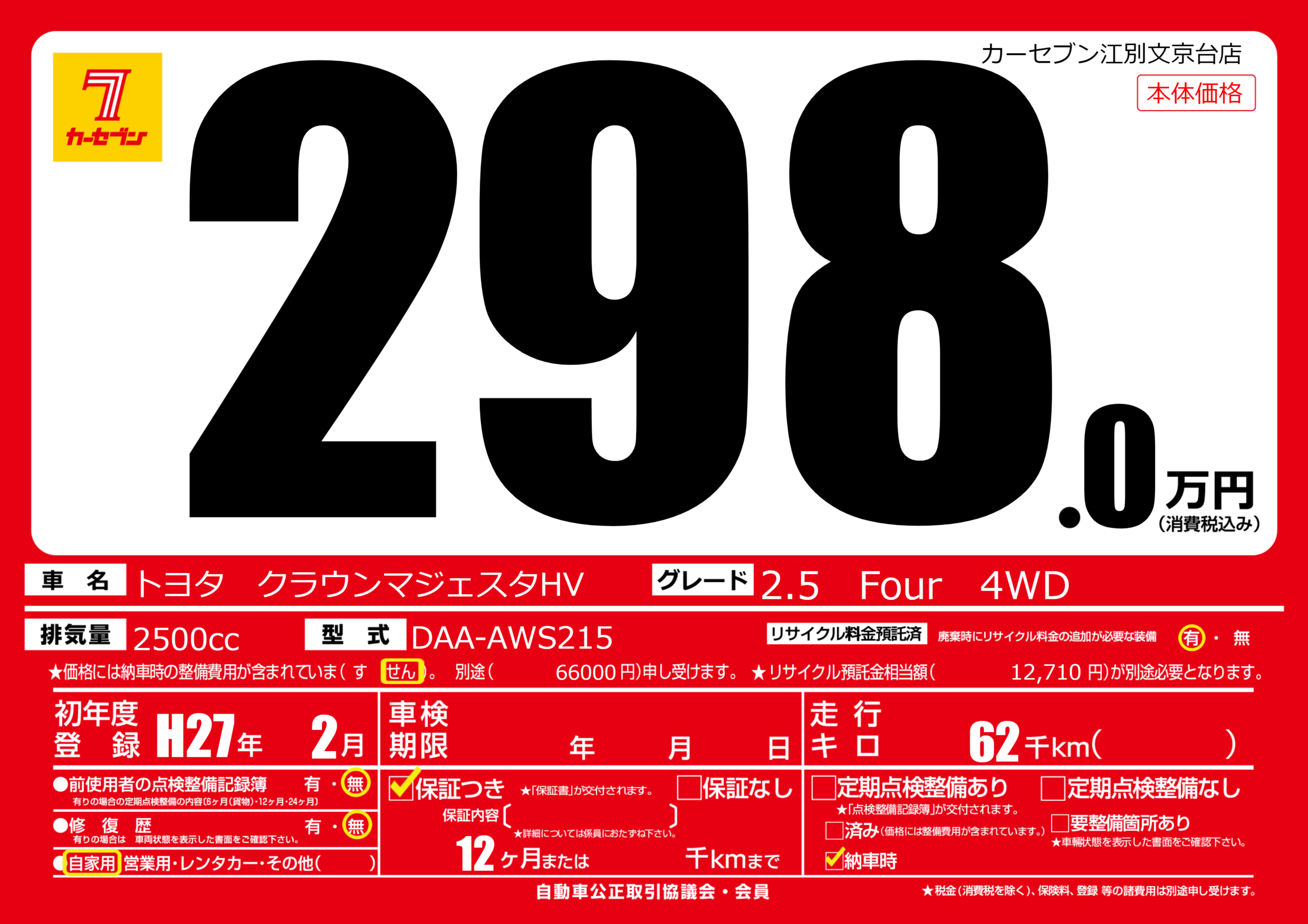 | 車名 | トヨタ クラウンマジェスタHV | グレード ミッション 排気量 |