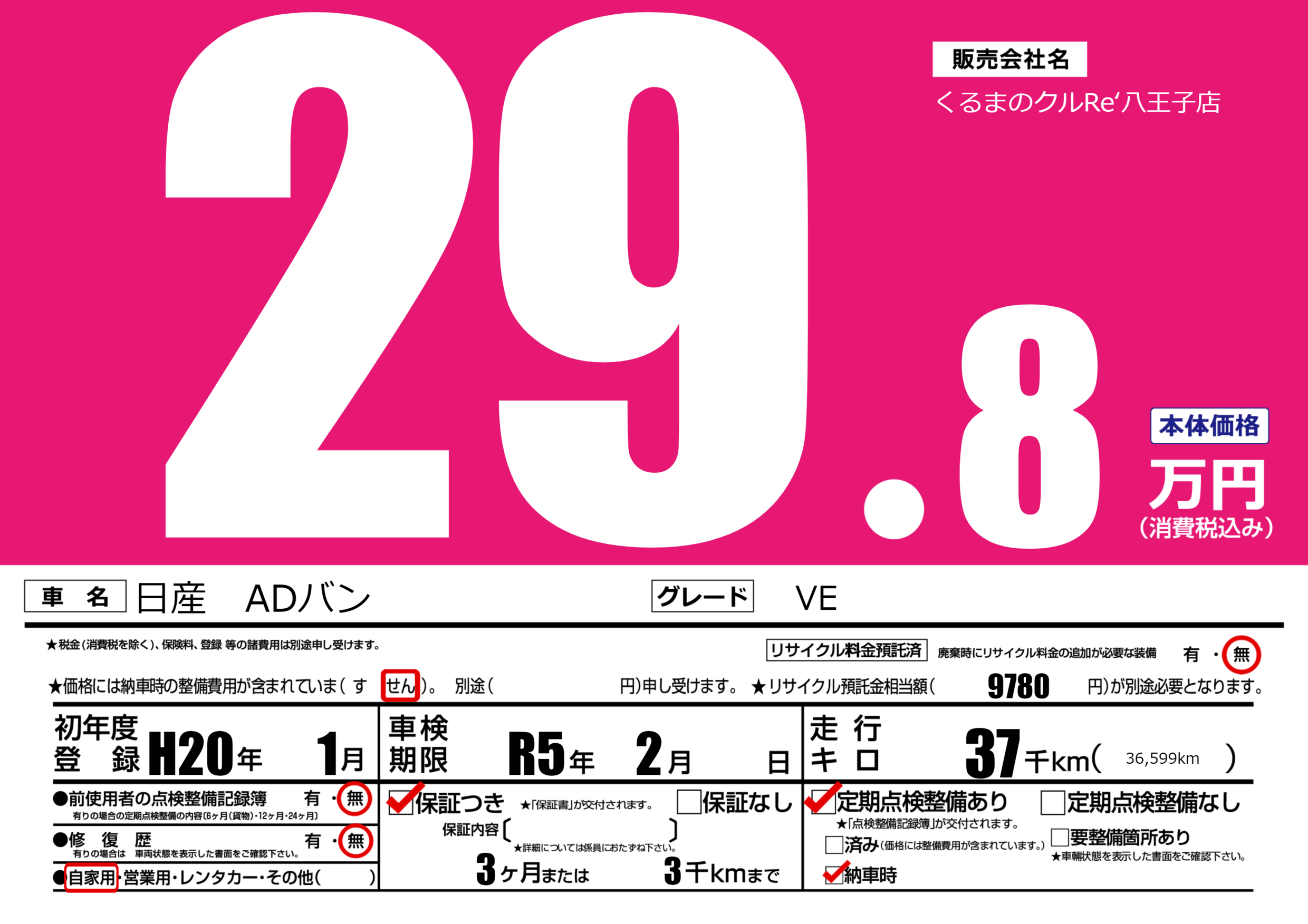 保証付き 保証内容(---) 3ヶ月または(3)千kmまで |