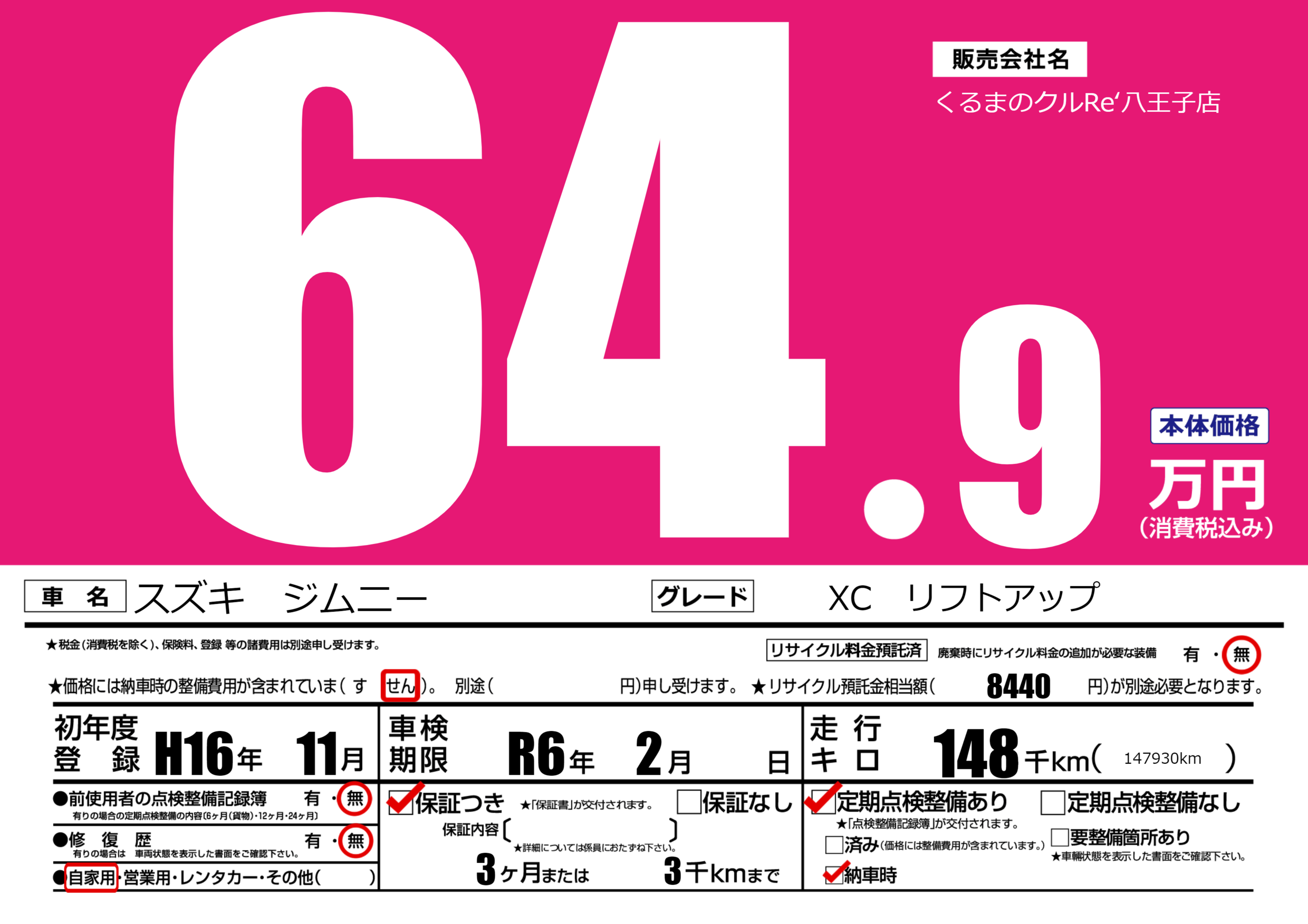 | 走行キロ | 14.8万km | 初年度登録 | H16年11月 |