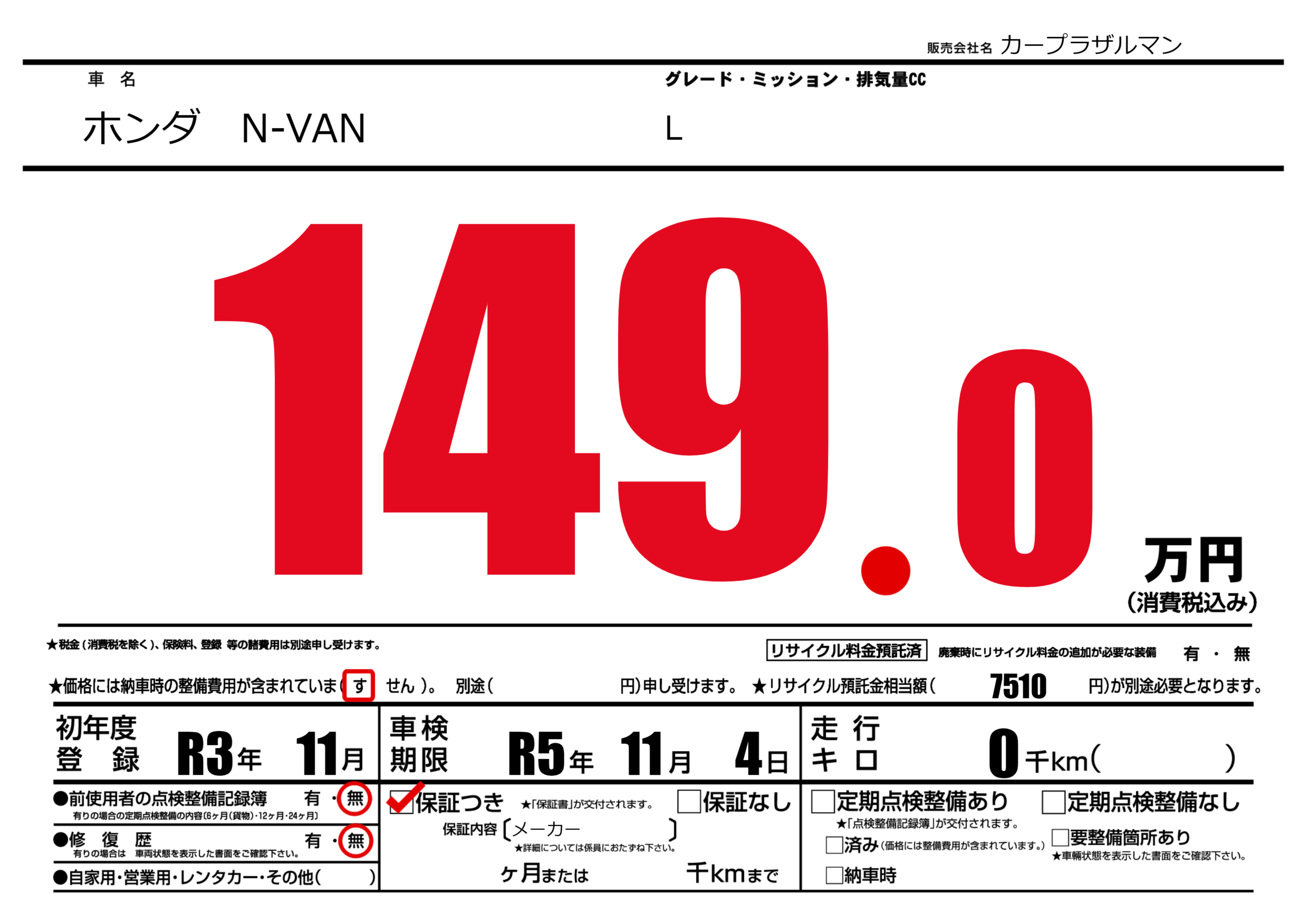 | 車名 | ホンダ N-VAN | グレード ミッション 排気量 |