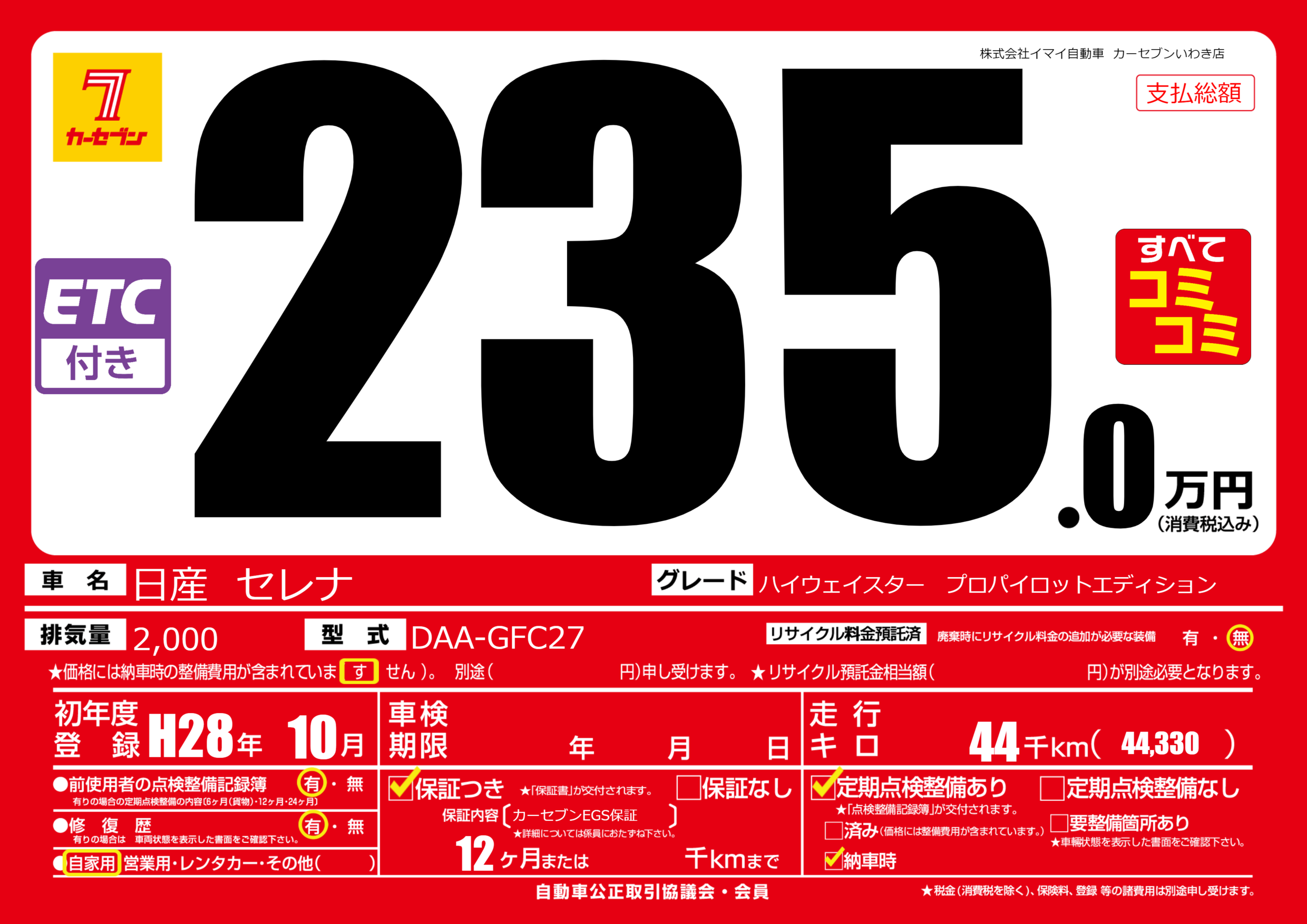 | 車名 | 日産 セレナ | グレード ミッション 排気量 |