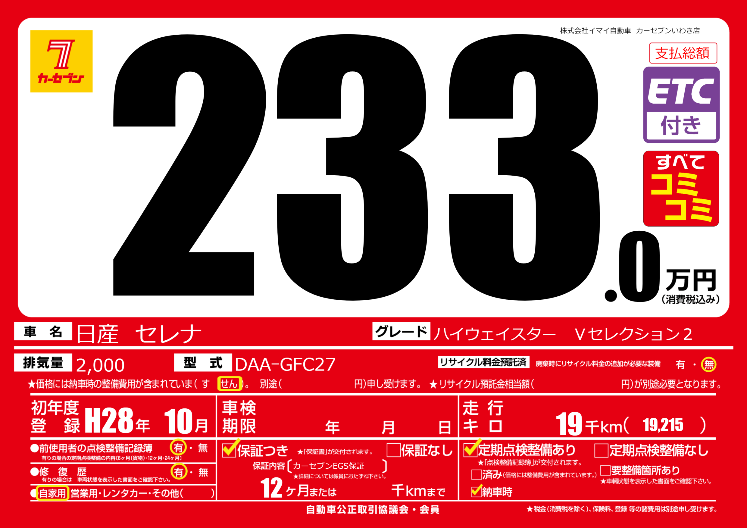 | 車名 | 日産 セレナ | グレード ミッション 排気量 |