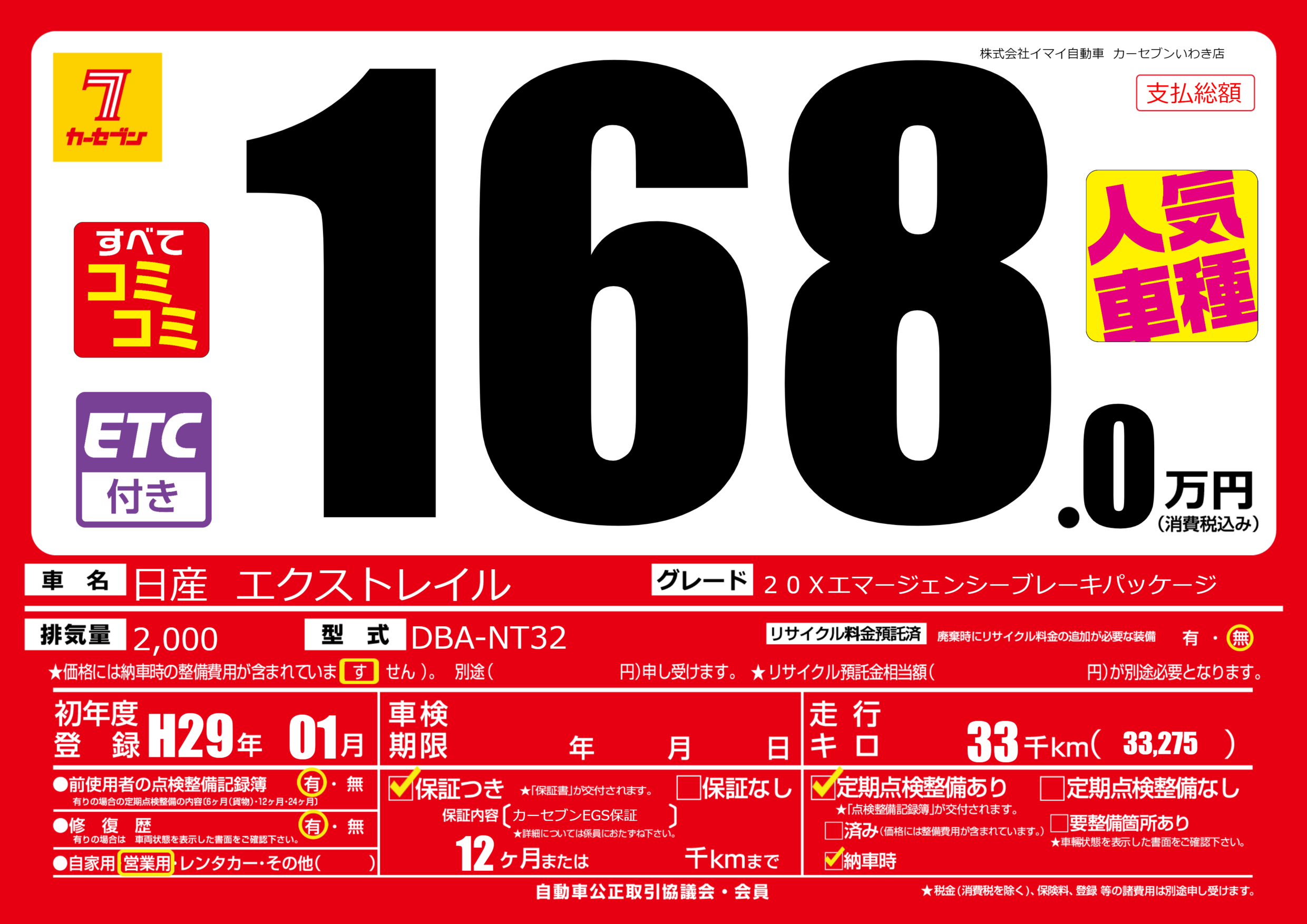 | 車名 | 日産 エクストレイル | グレード ミッション 排気量 |
