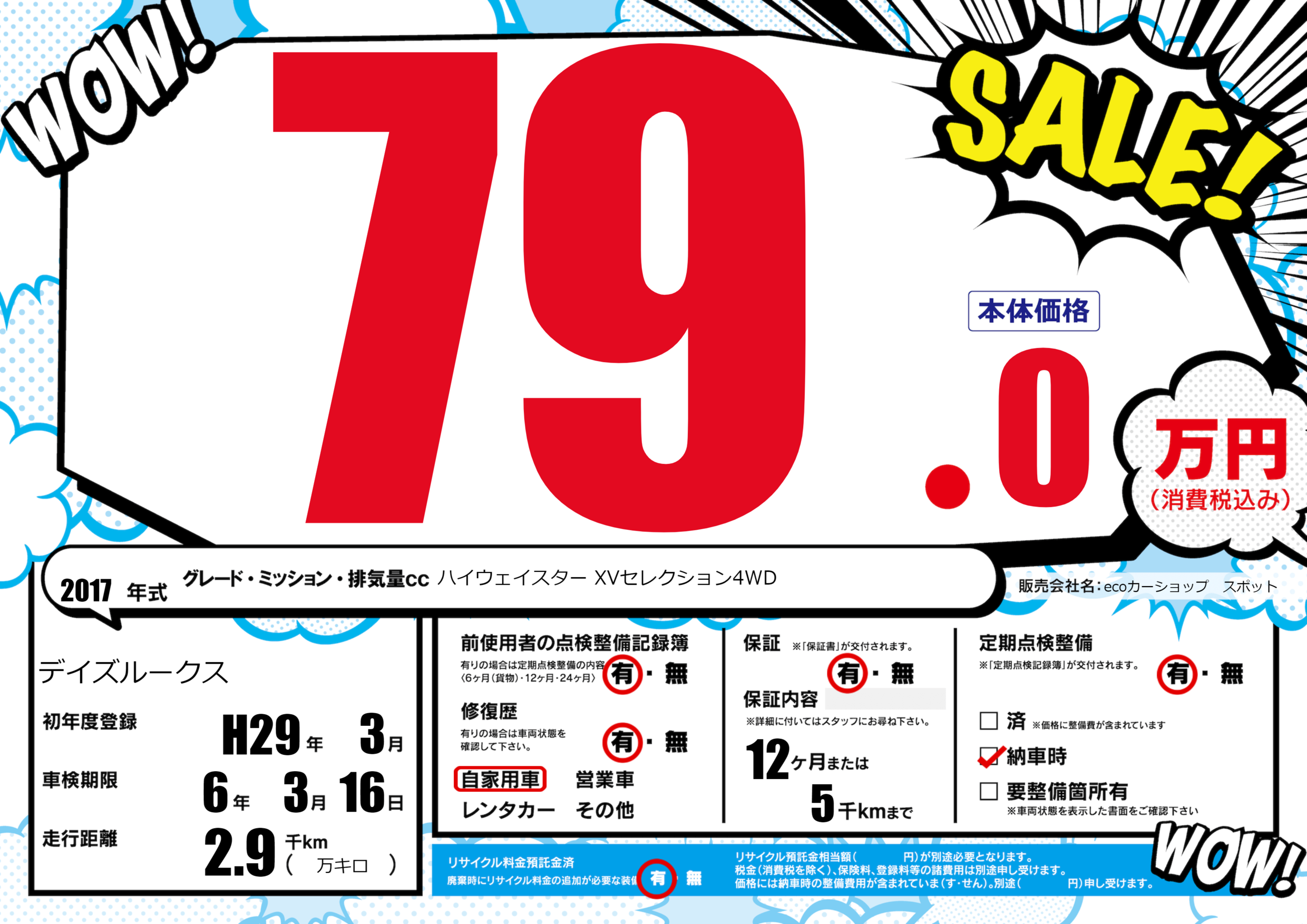 | 走行キロ | 0.2万km | 初年度登録 | H29年3月 |