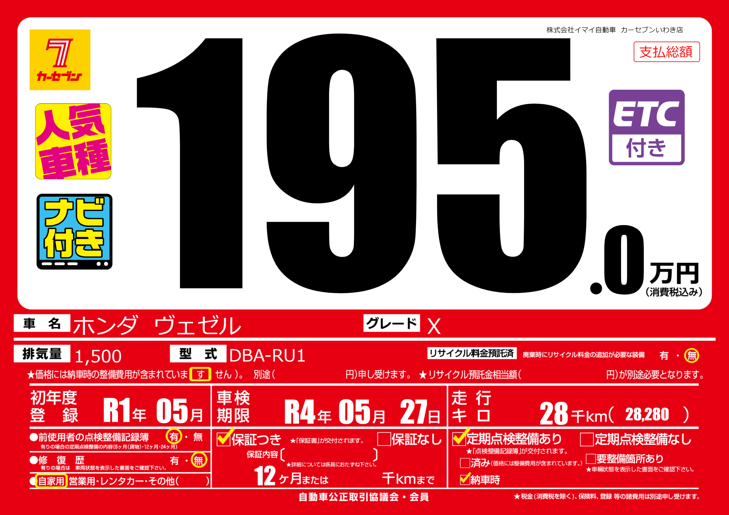 | 車名 | ホンダ ヴェゼル | グレード ミッション 排気量 |