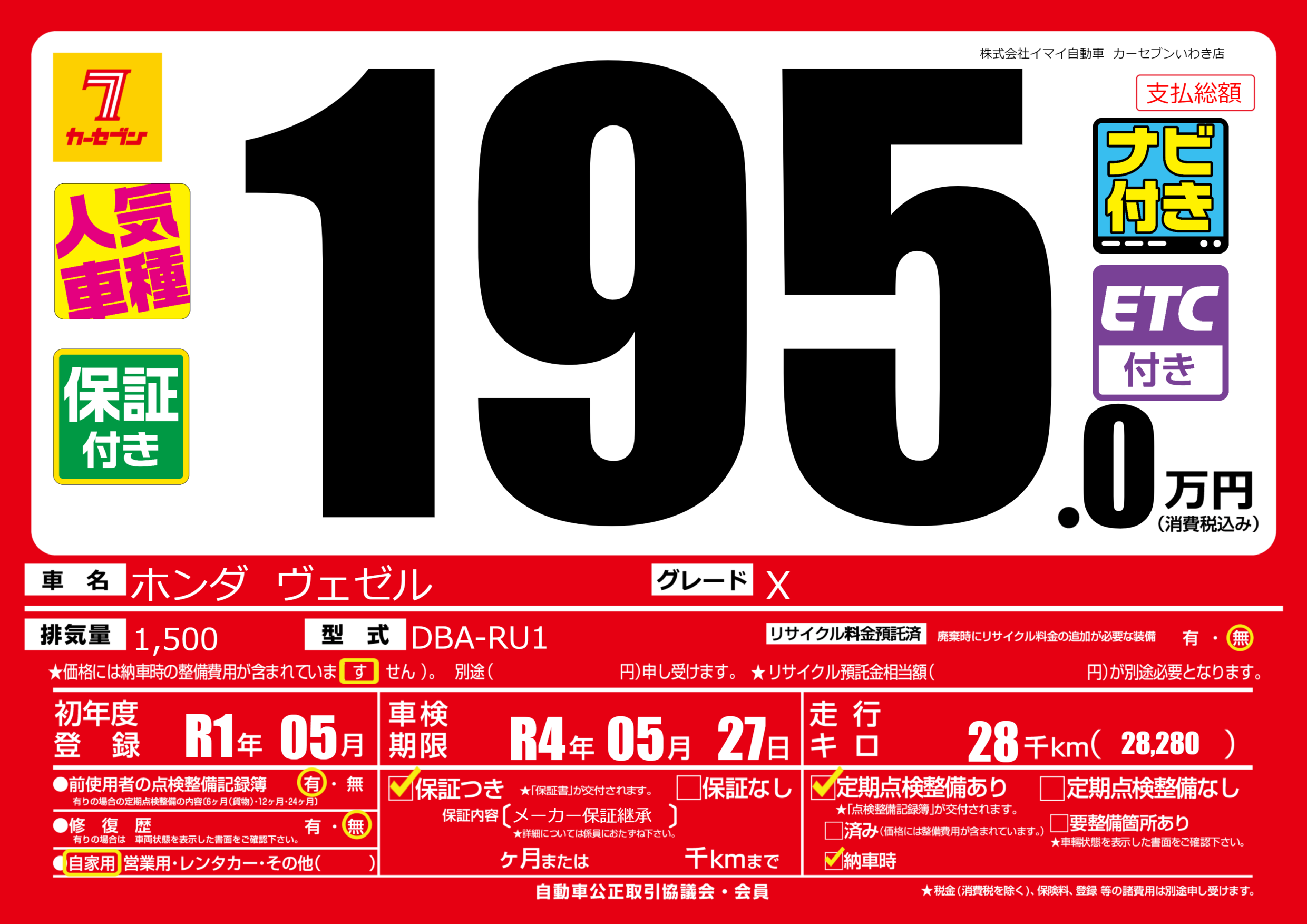 | 走行キロ | 2.8万km | 初年度登録 | R1年05月 |