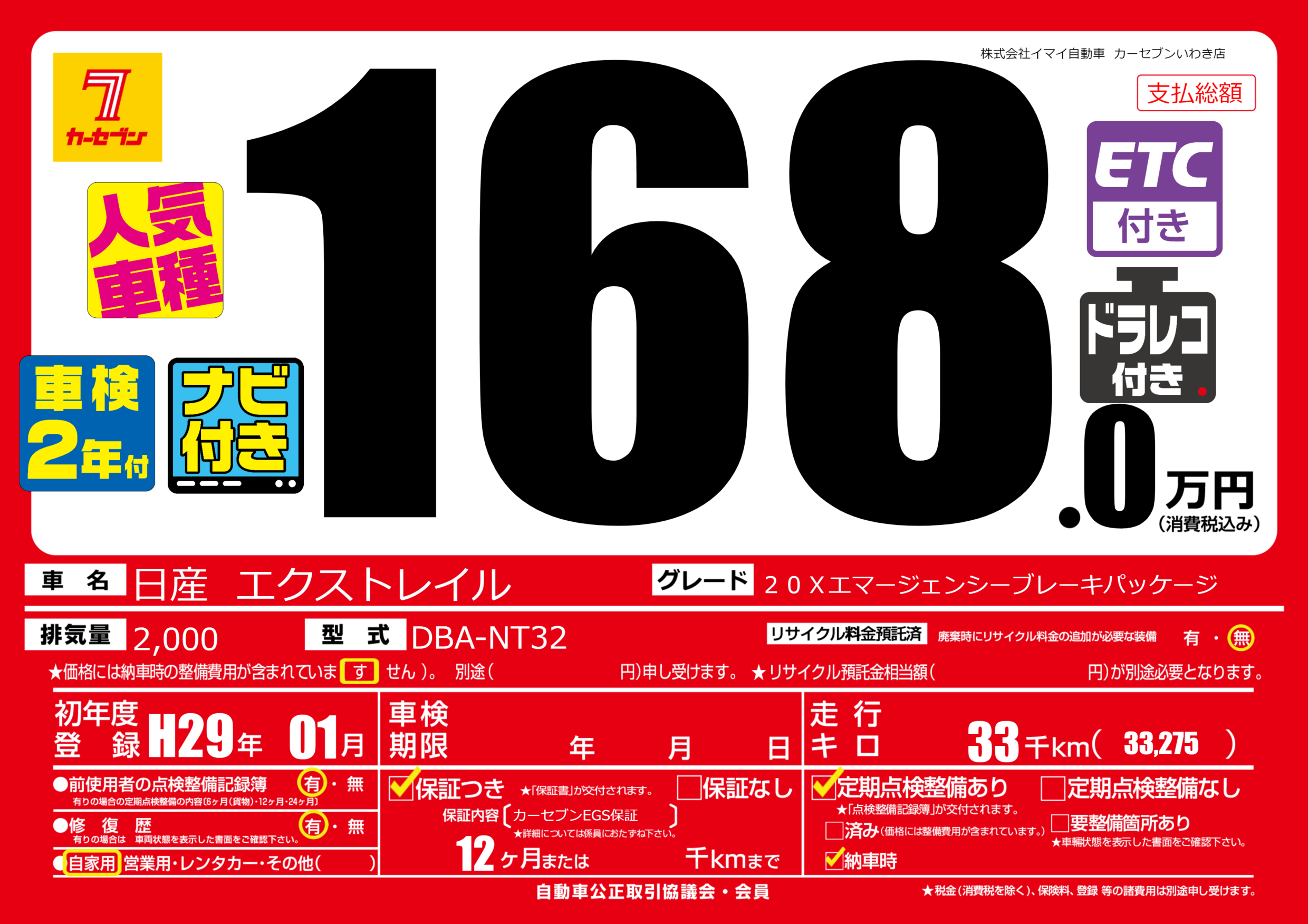 | 車名 | 日産 エクストレイル | グレード ミッション 排気量 |