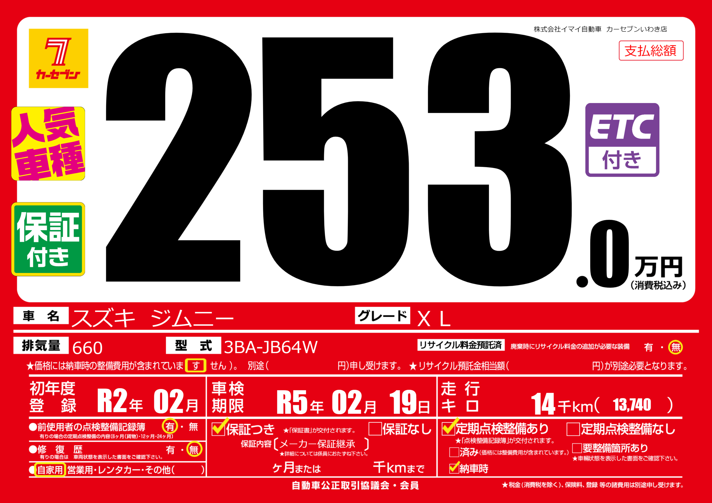 | 走行キロ | 1.4万km | 初年度登録 | R2年02月 |