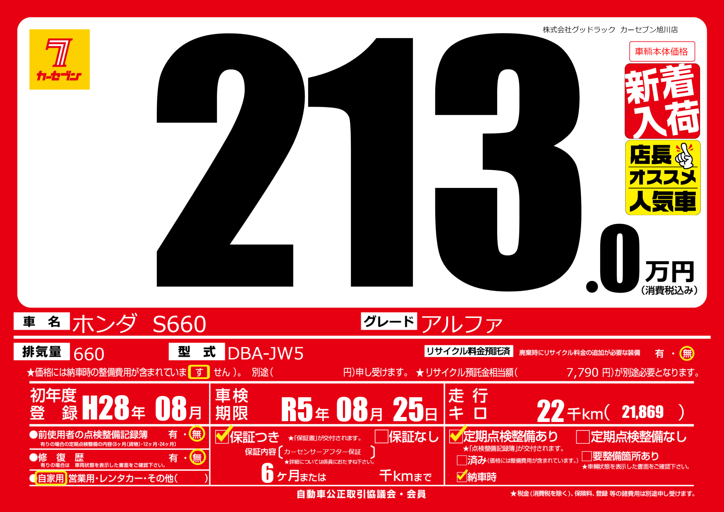 | 車名 | ホンダ S660 | グレード ミッション 排気量 |