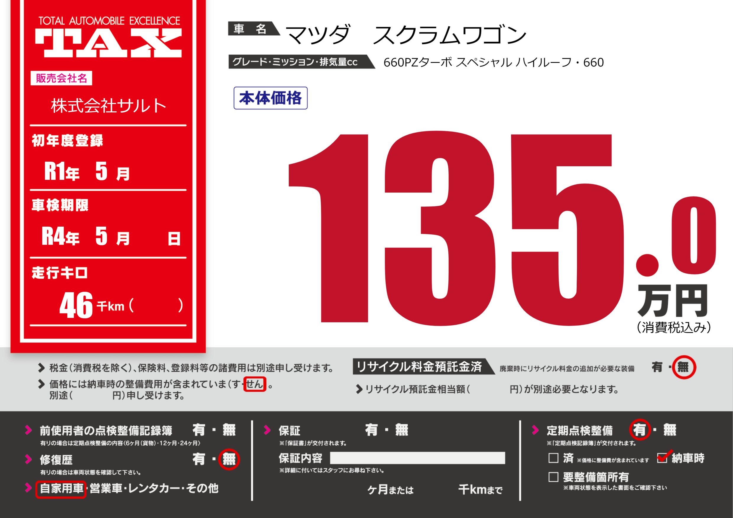 | 車名 | マツダ スクラムワゴン | グレード ミッション 排気量 |