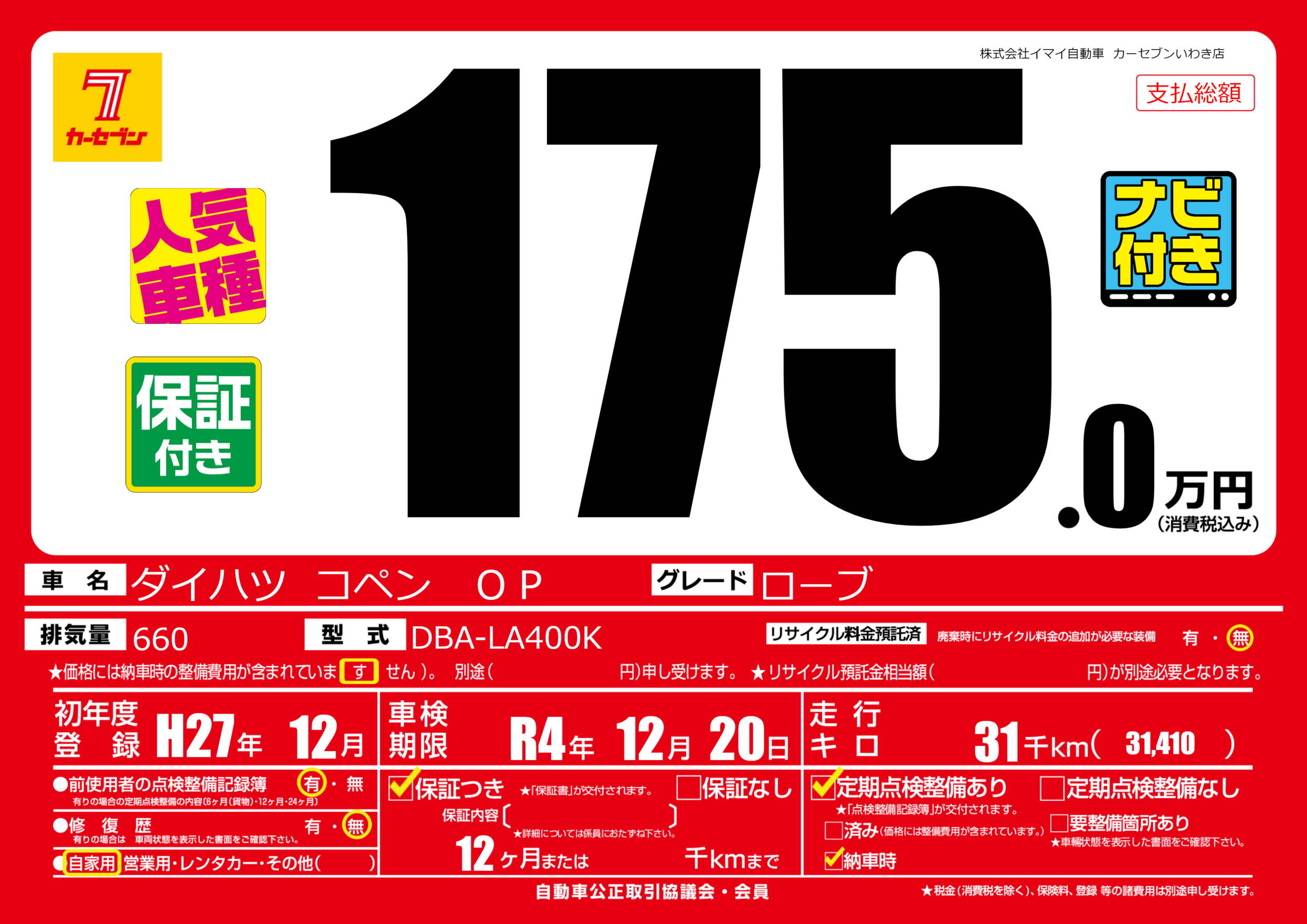 保証付き 保証内容(---) 12ヶ月または()千kmまで |