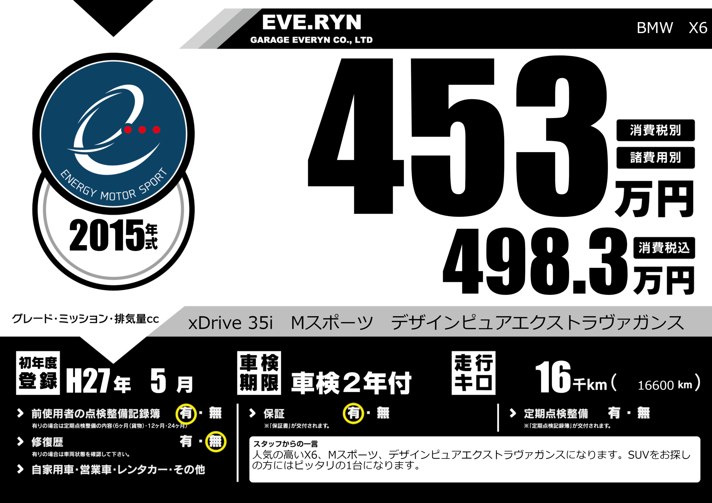 | 車名 | BMW X6 | グレード ミッション 排気量 |