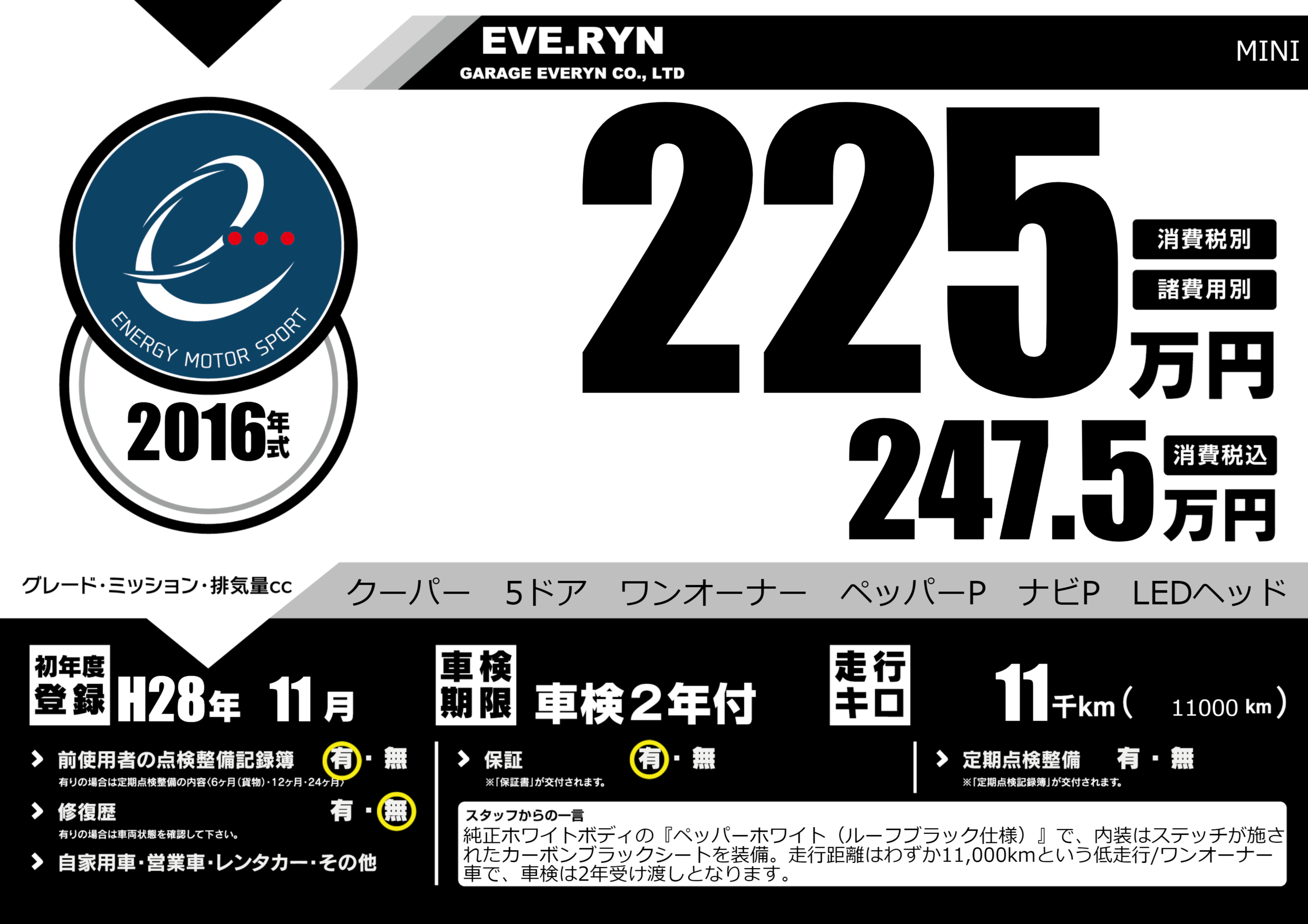 | 走行キロ | 1.1万km | 初年度登録 | H28年11月 |