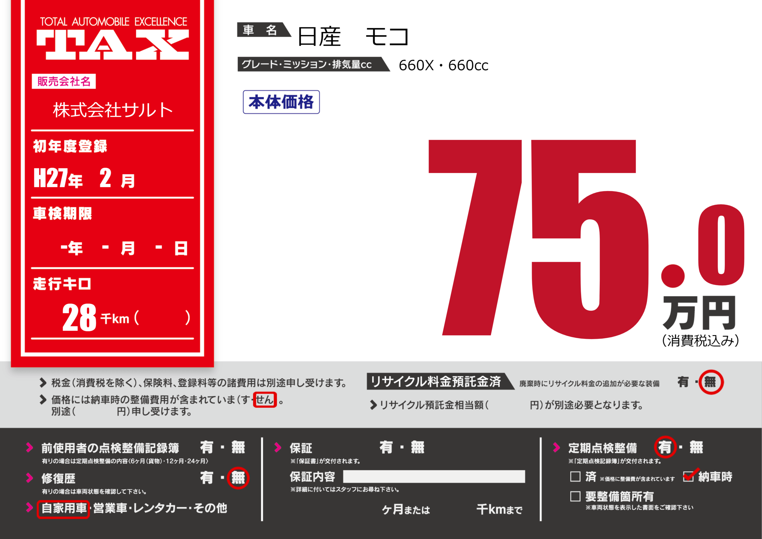 | 車名 | 日産 モコ | グレード ミッション 排気量 |