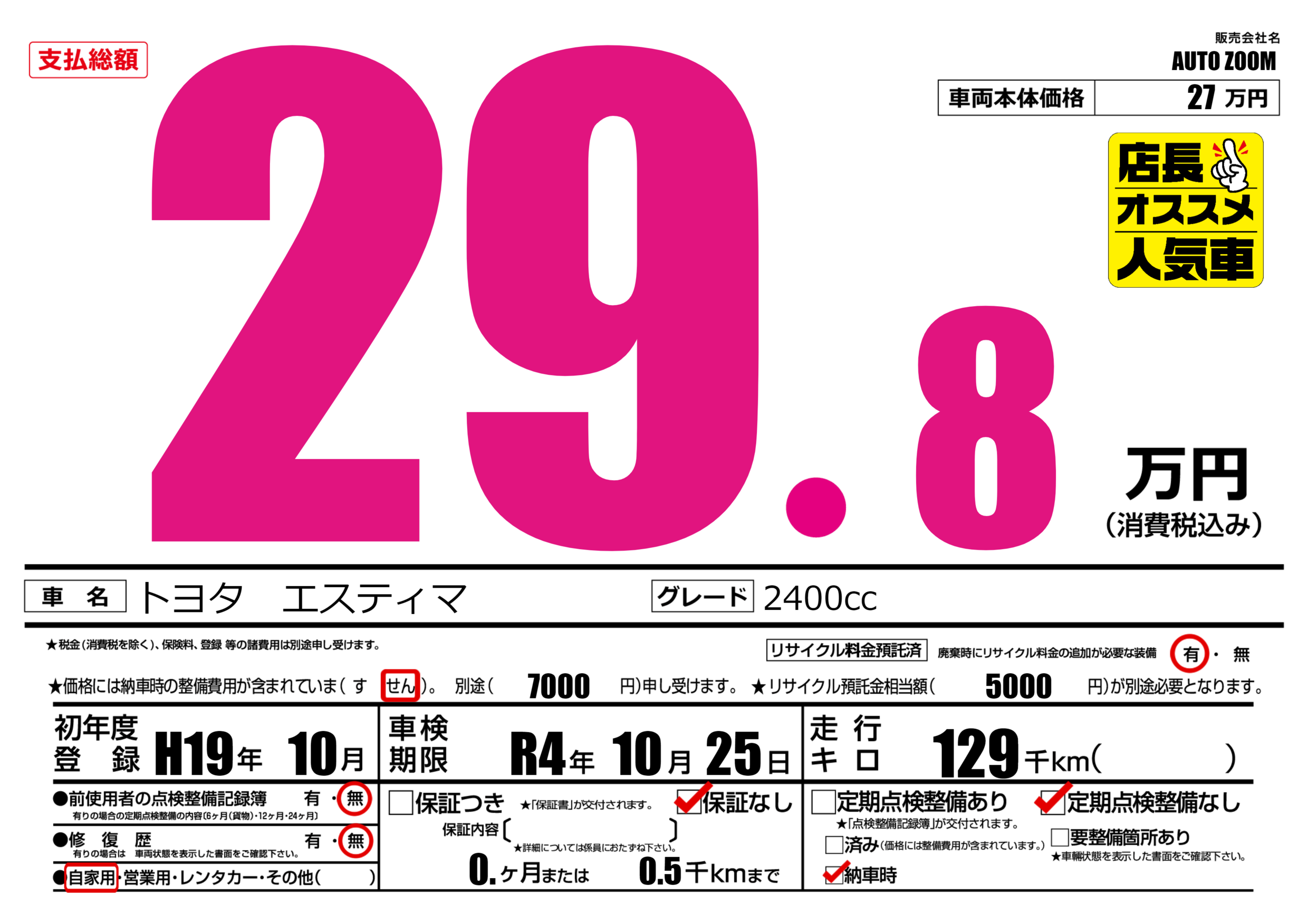 | 車名 | トヨタ エスティマ | グレード ミッション 排気量 |