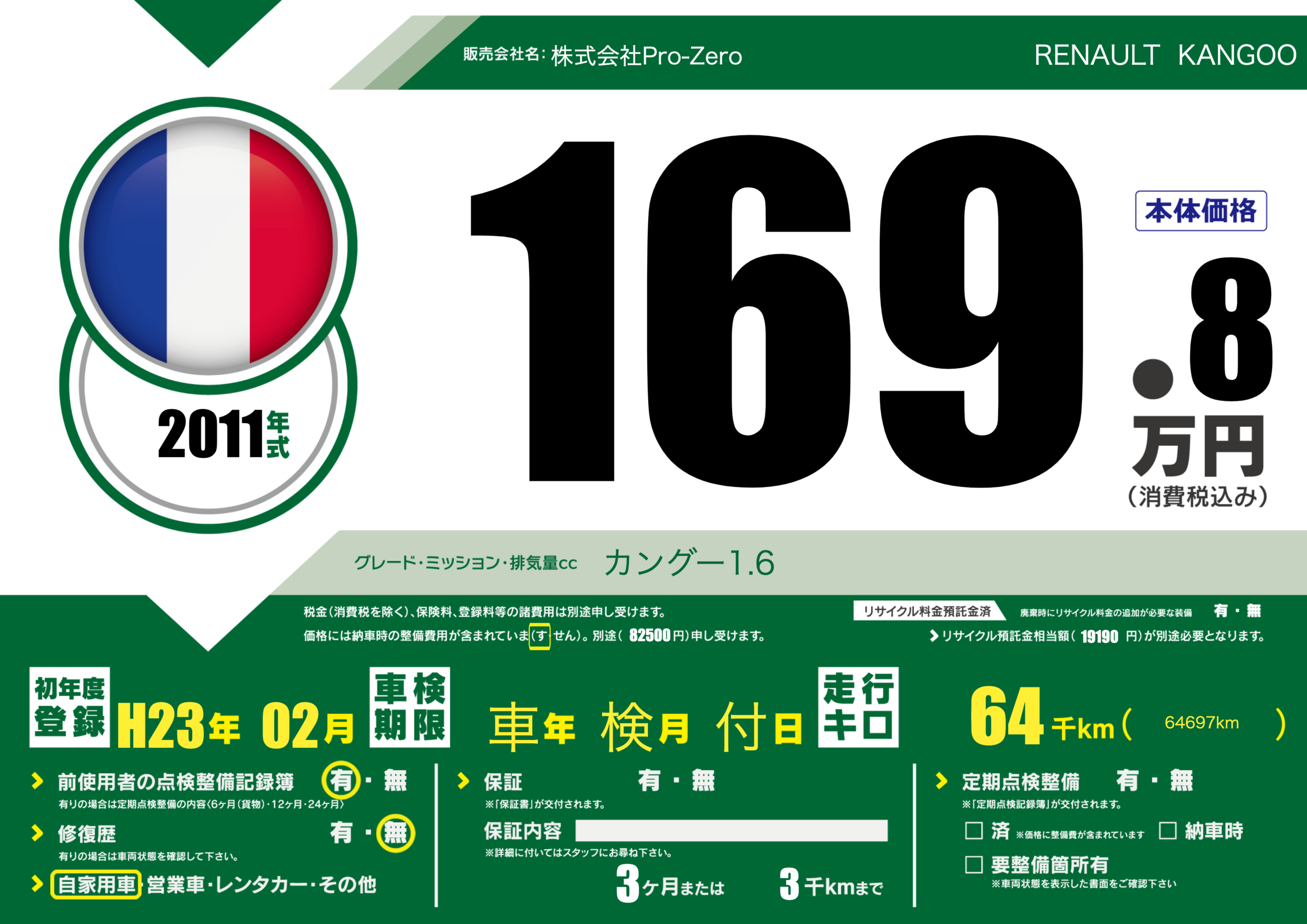 | 車名 | RENAULT KANGOO | グレード ミッション 排気量 |