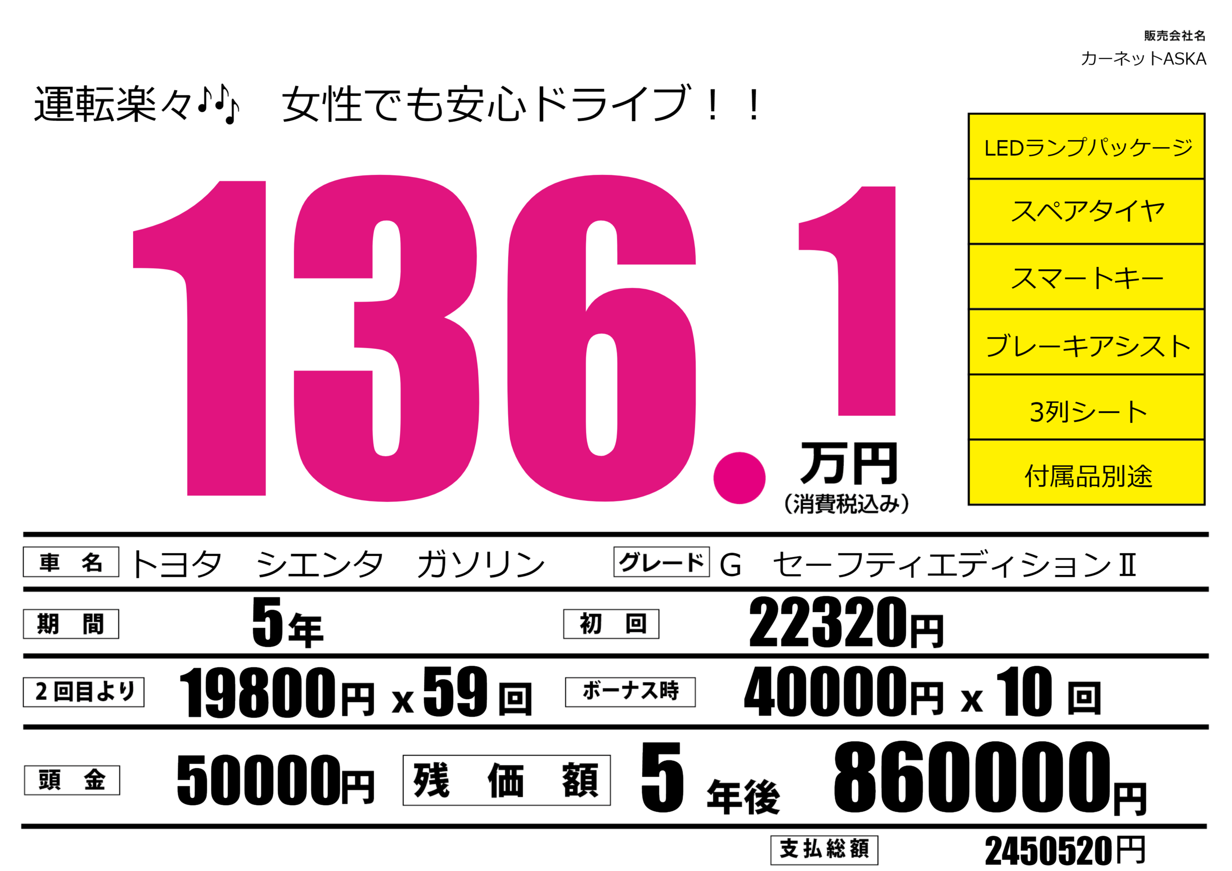 | 車名 | トヨタ シエンタ ガソリン | グレード ミッション 排気量 |