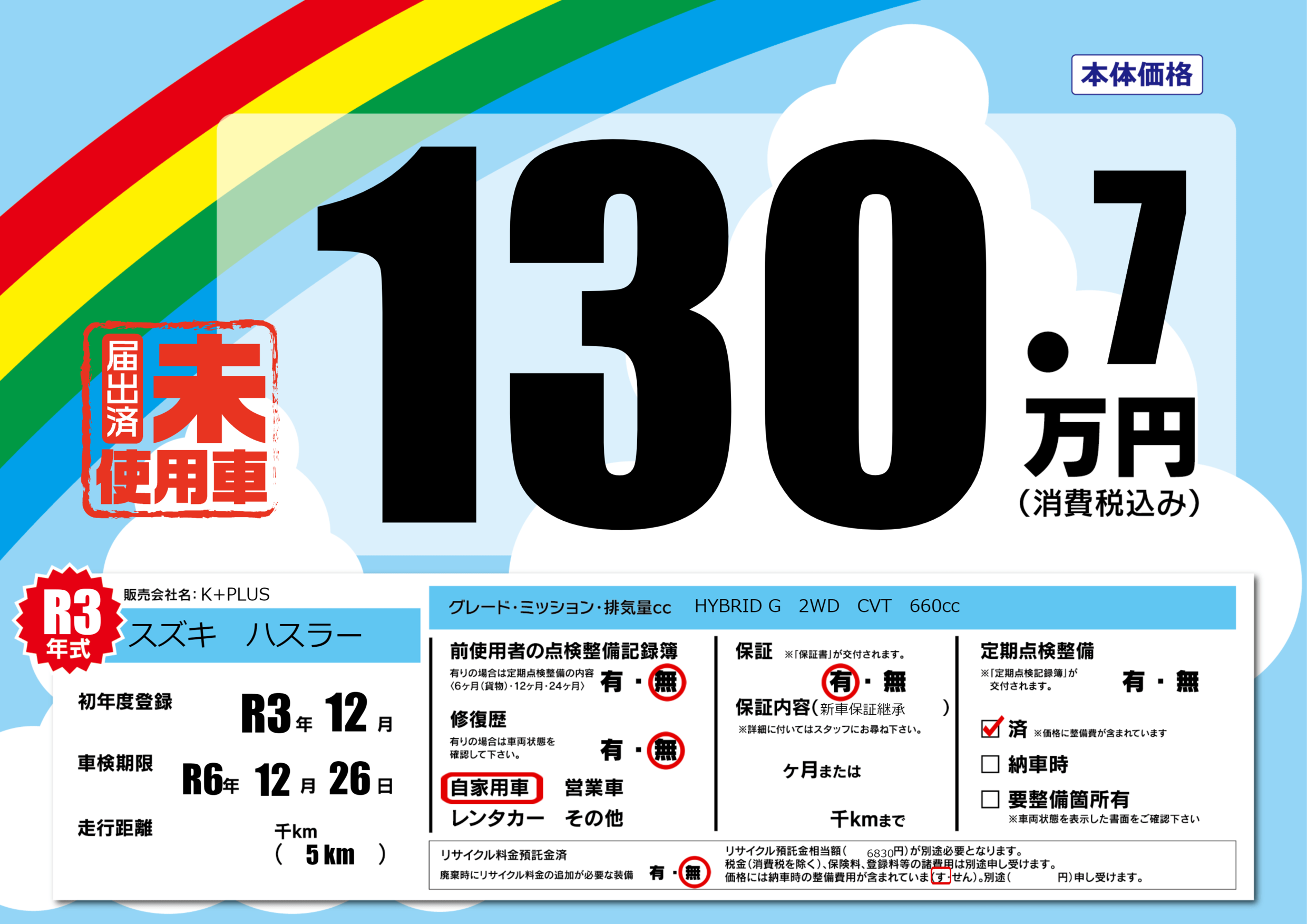 | 車名 | スズキ ハスラー | グレード ミッション 排気量 |