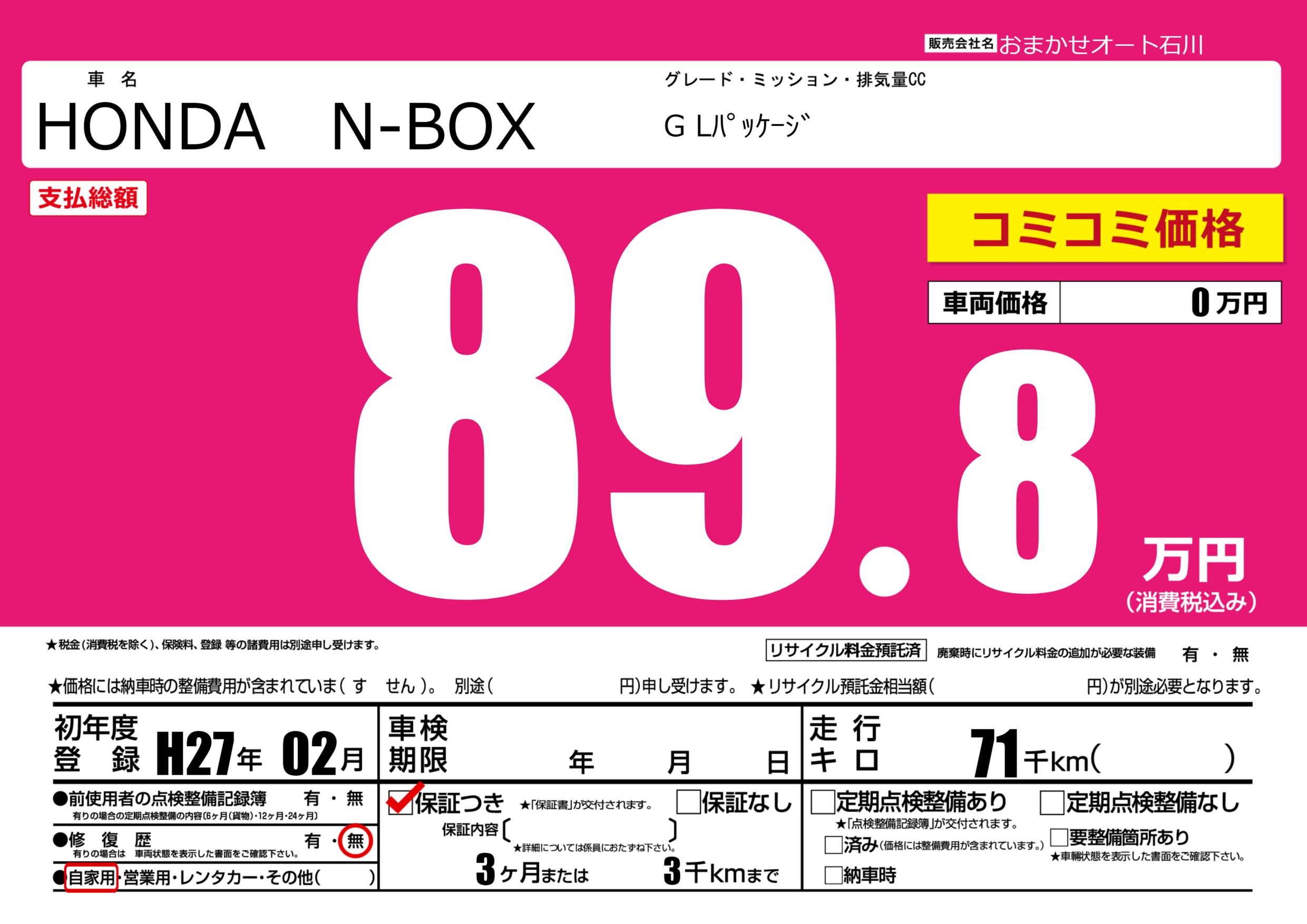 | 車名 | HONDA N-BOX | グレード ミッション 排気量 |