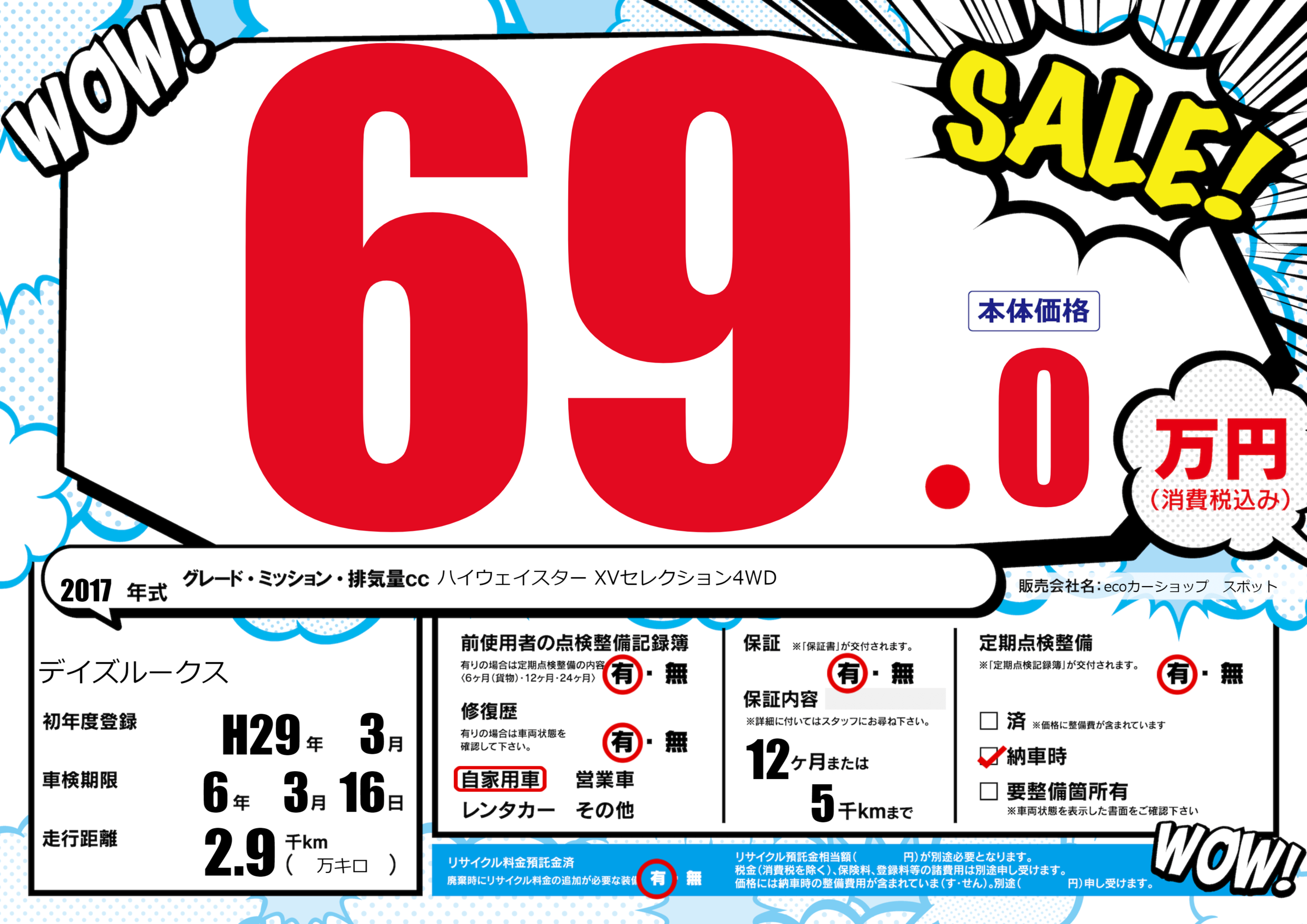 | 走行キロ | 0.2万km | 初年度登録 | H29年3月 |