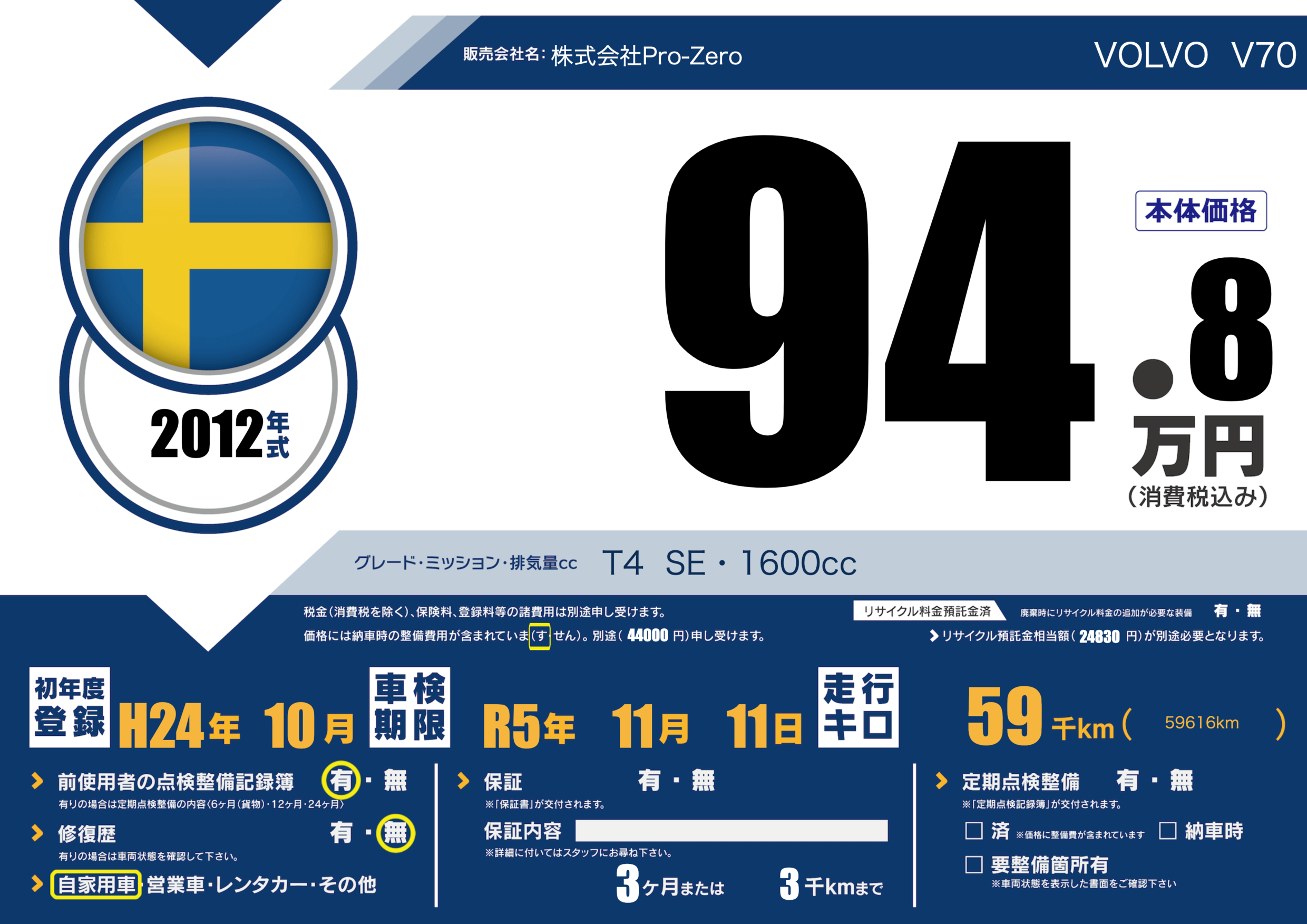 | 車名 | VOLVO V70 | グレード ミッション 排気量 |