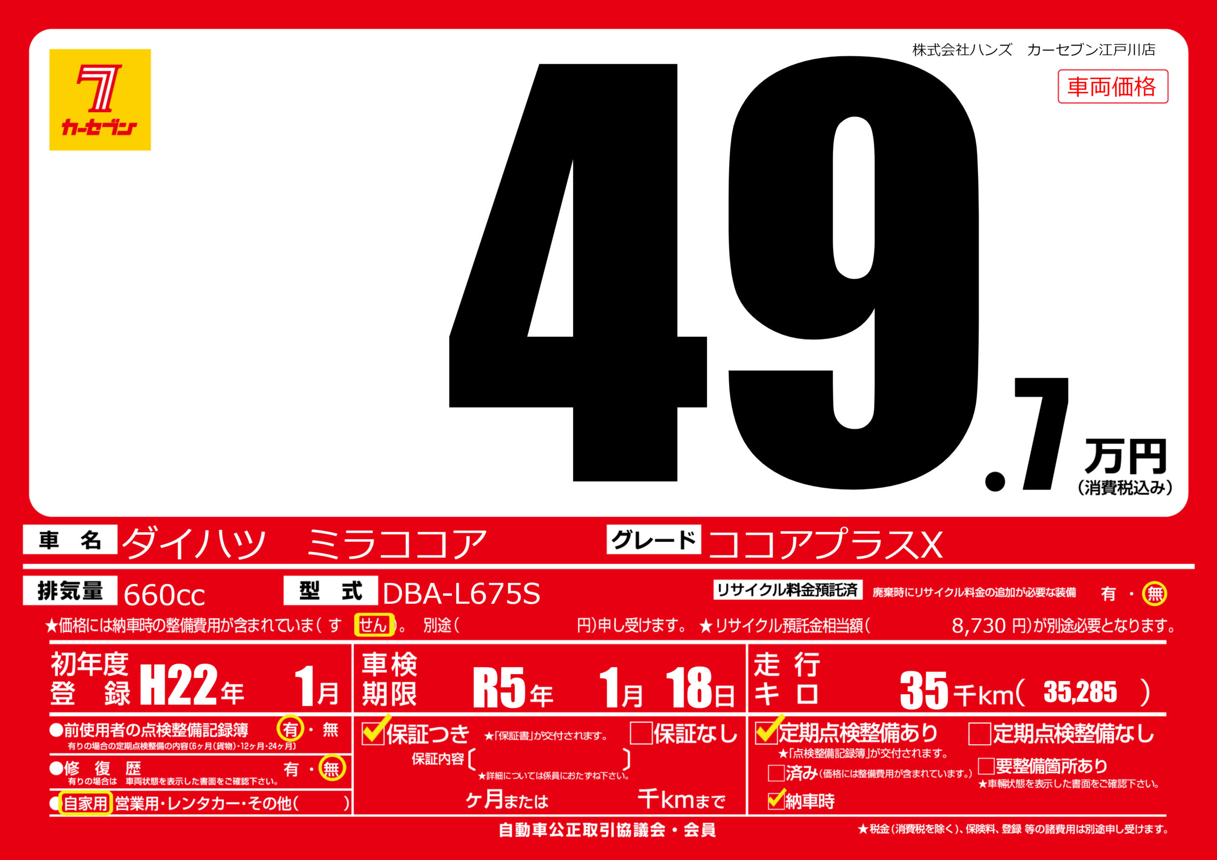 | 走行キロ | 3.5万km | 初年度登録 | H22年1月 |