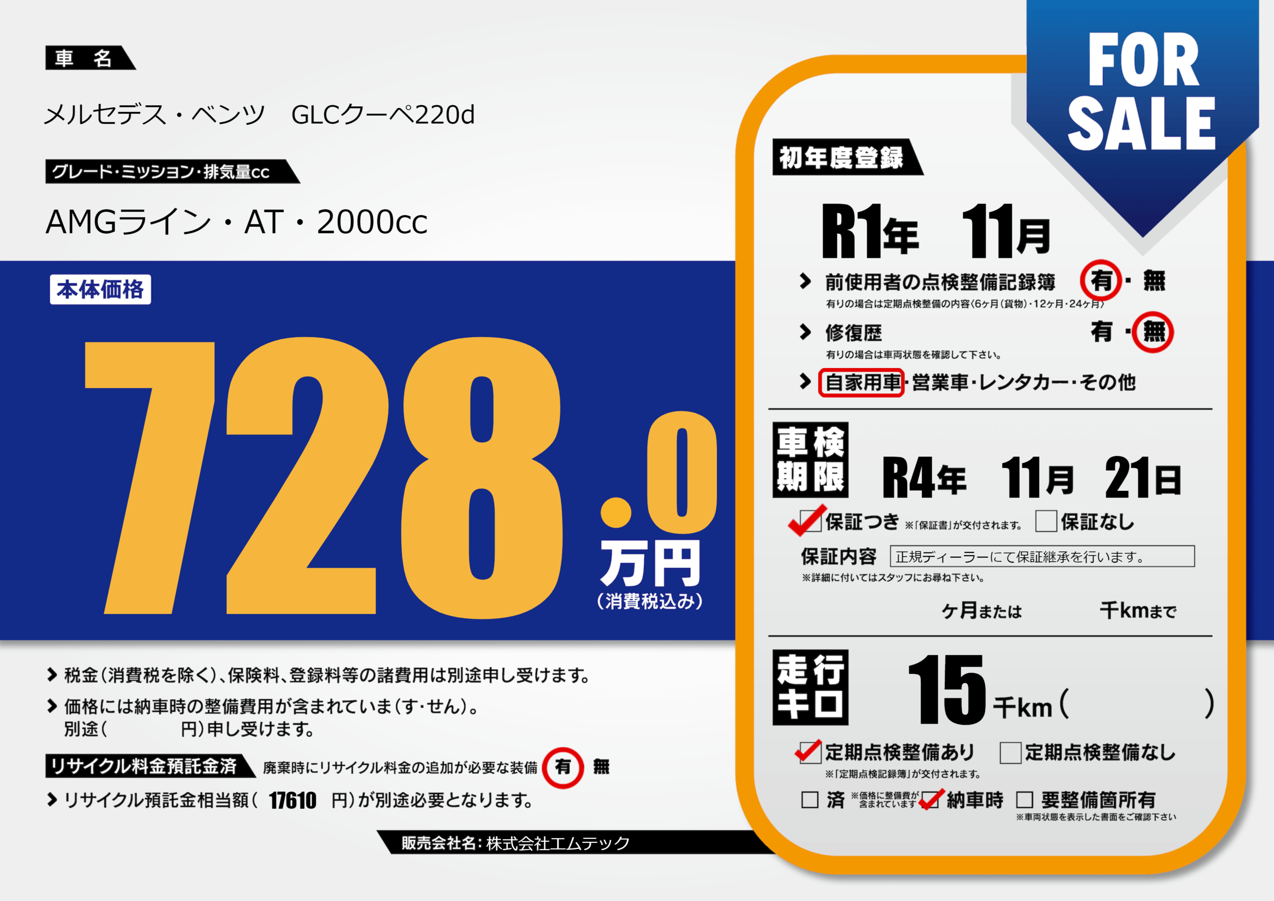 | 車名 | メルセデス・ベンツ GLCクーペ220d | グレード ミッション 排気量 |