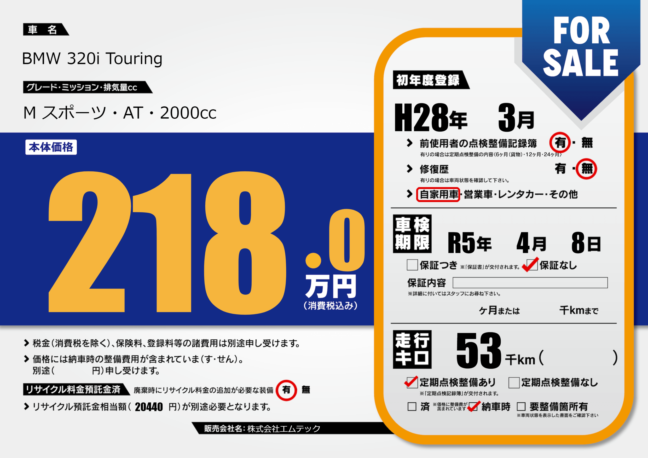 | 車名 | BMW 320i Touring | グレード ミッション 排気量 |