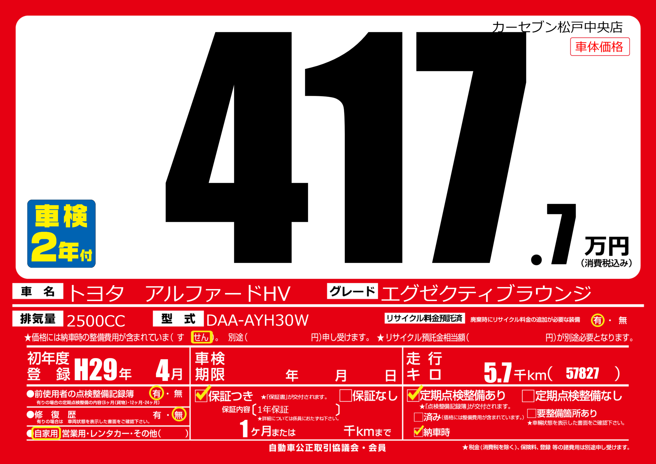 | 車名 | トヨタ アルファードHV | グレード ミッション 排気量 |