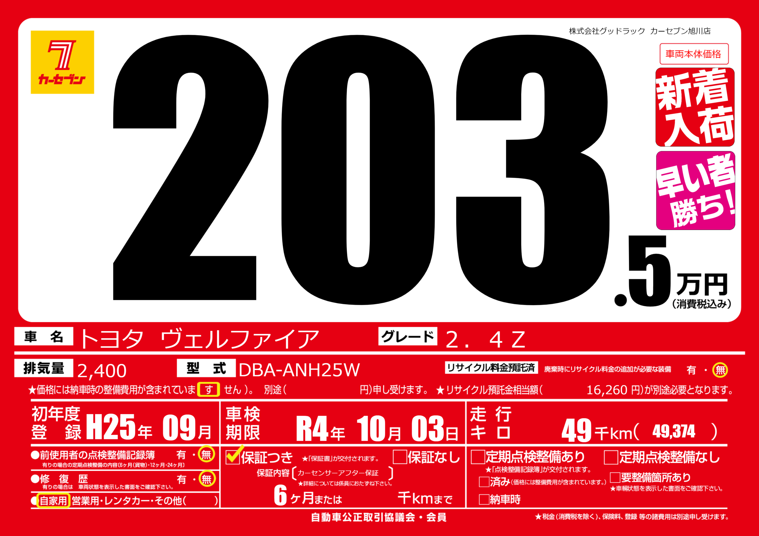 | 車名 | トヨタ ヴェルファイア | グレード ミッション 排気量 |