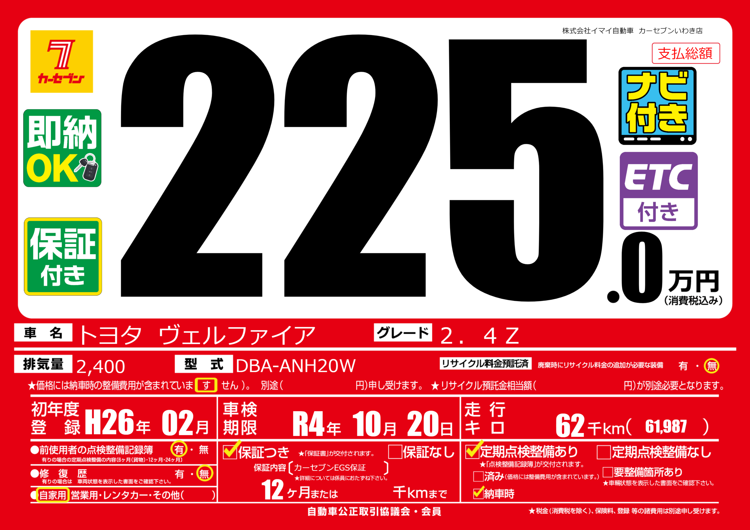 | 車名 | トヨタ ヴェルファイア | グレード ミッション 排気量 |