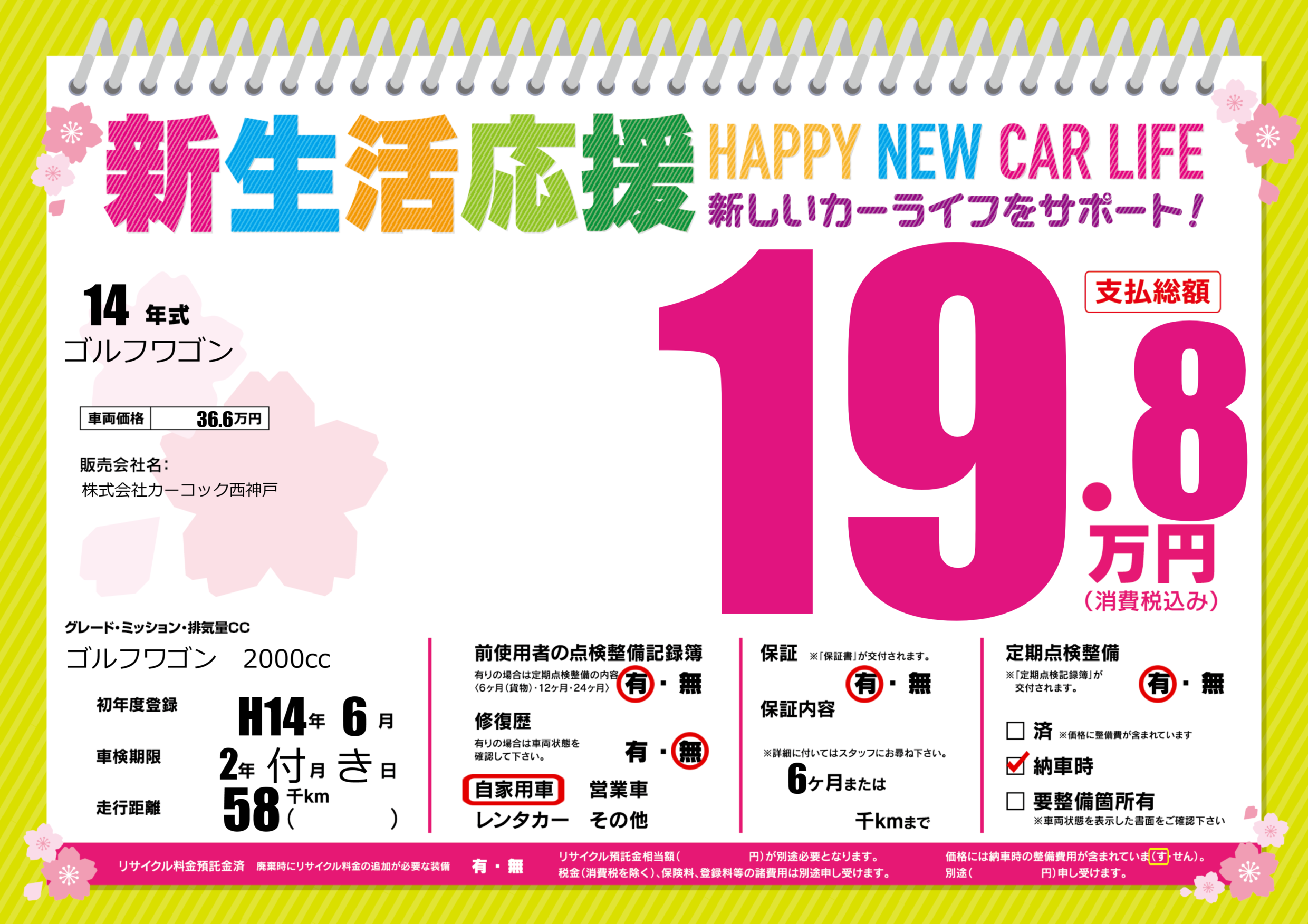 | 走行キロ | 5.8万km | 初年度登録 | H14年6月 |