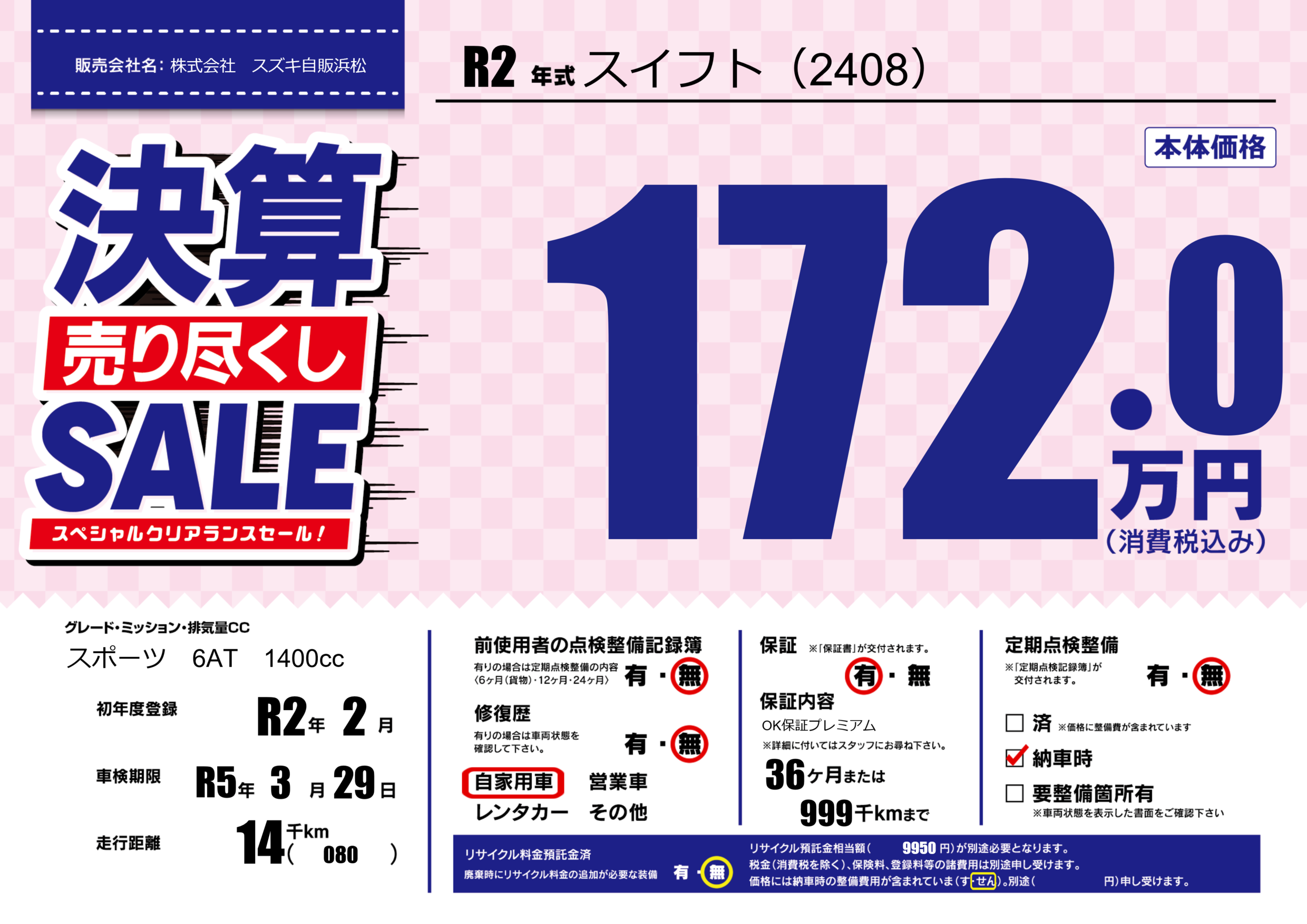 | 車名 | スイフト(2408) | グレード ミッション 排気量 |