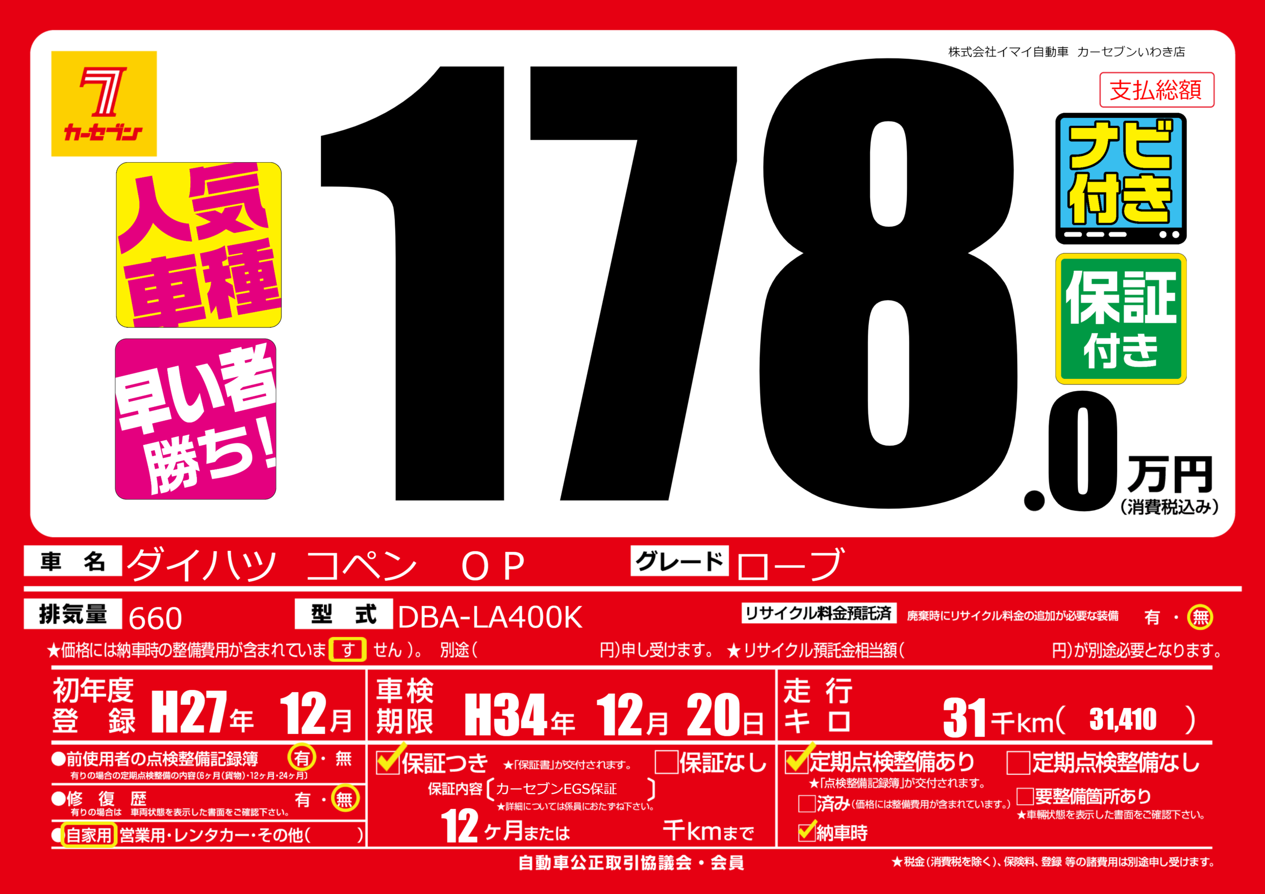 | 車名 | ダイハツ コペン OP | グレード ミッション 排気量 |