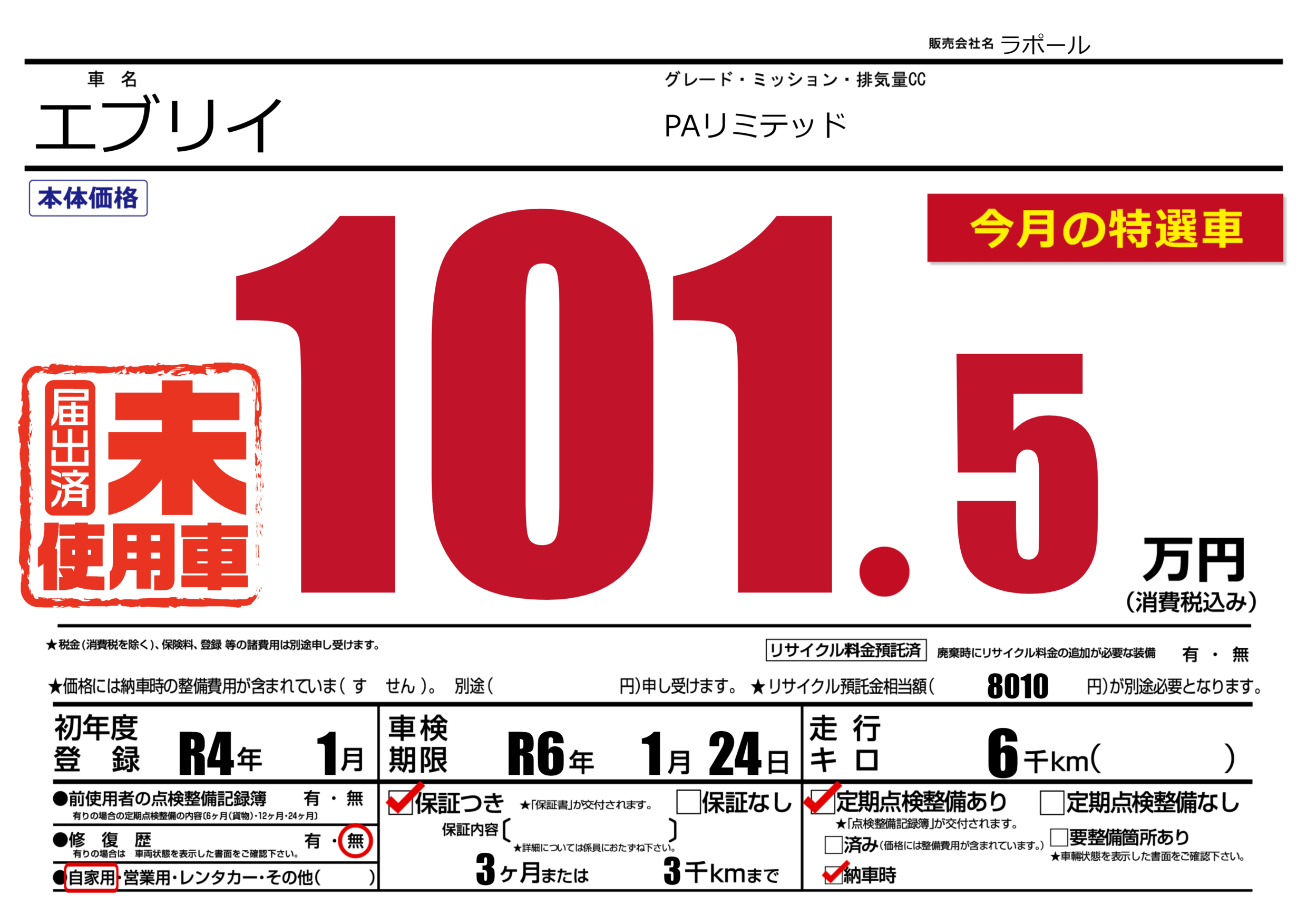 | 走行キロ | 0.6万km | 初年度登録 | R4年1月 |
