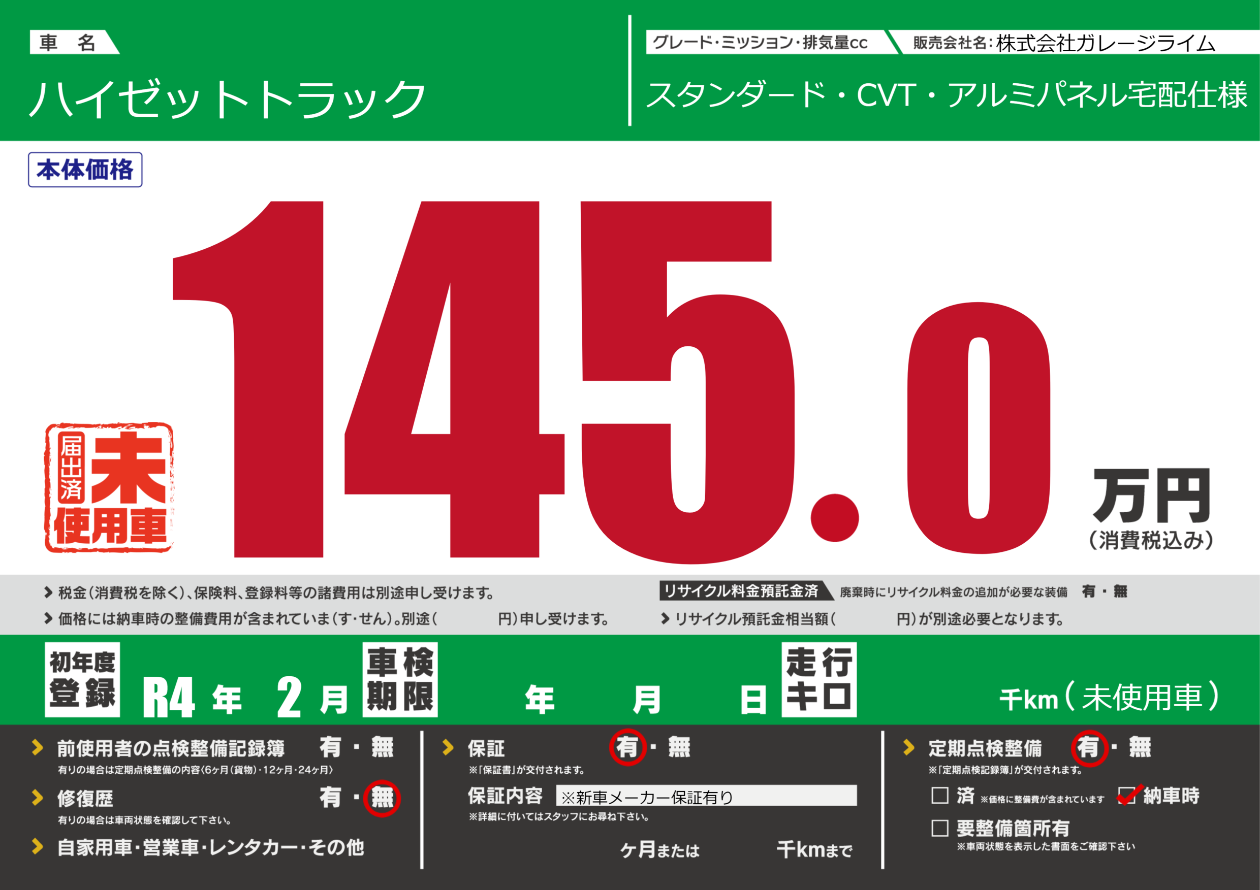 | 車名 | ハイゼットトラック | グレード ミッション 排気量 |