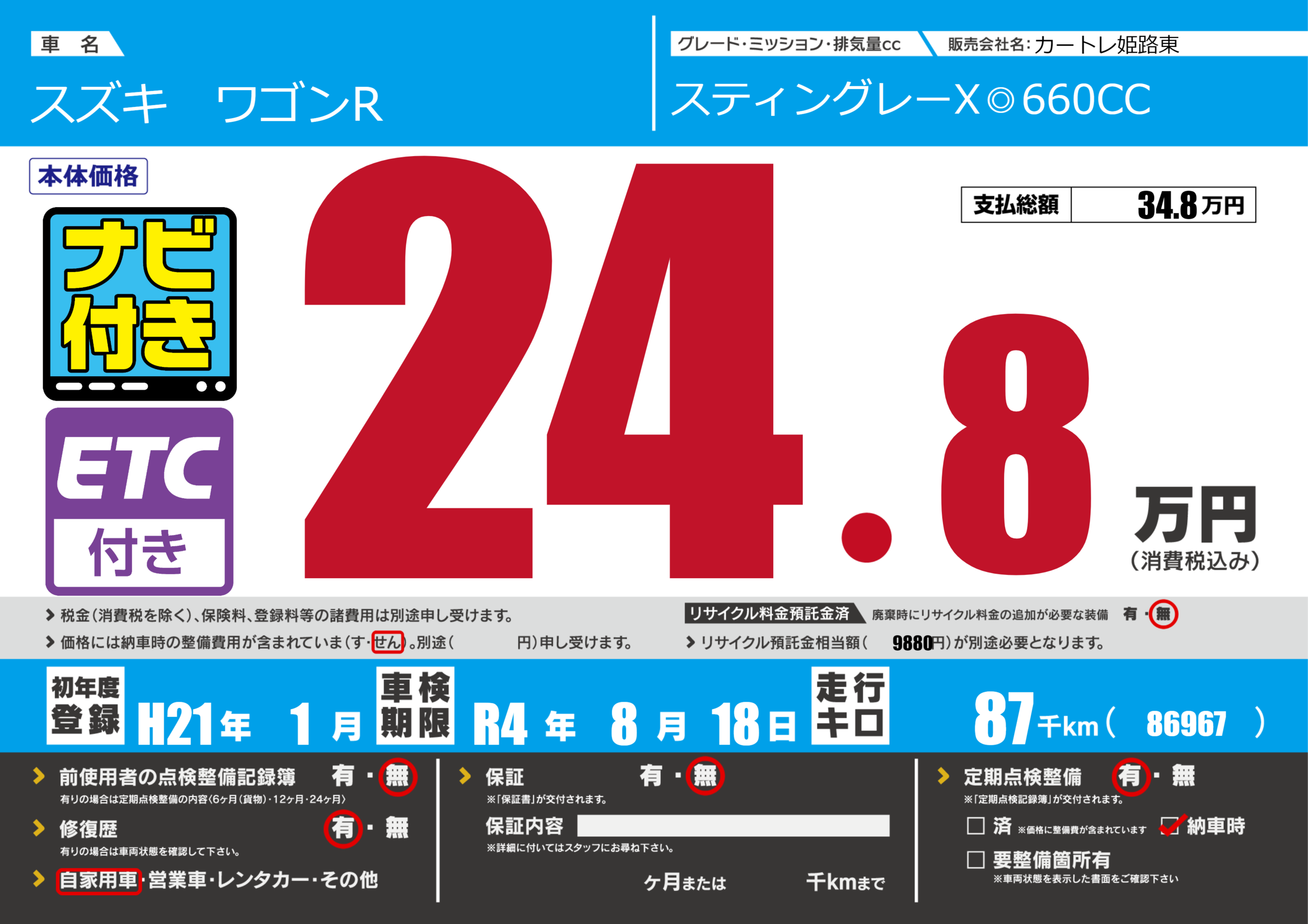 | 走行キロ | 8.7万km | 初年度登録 | H21年1月 |