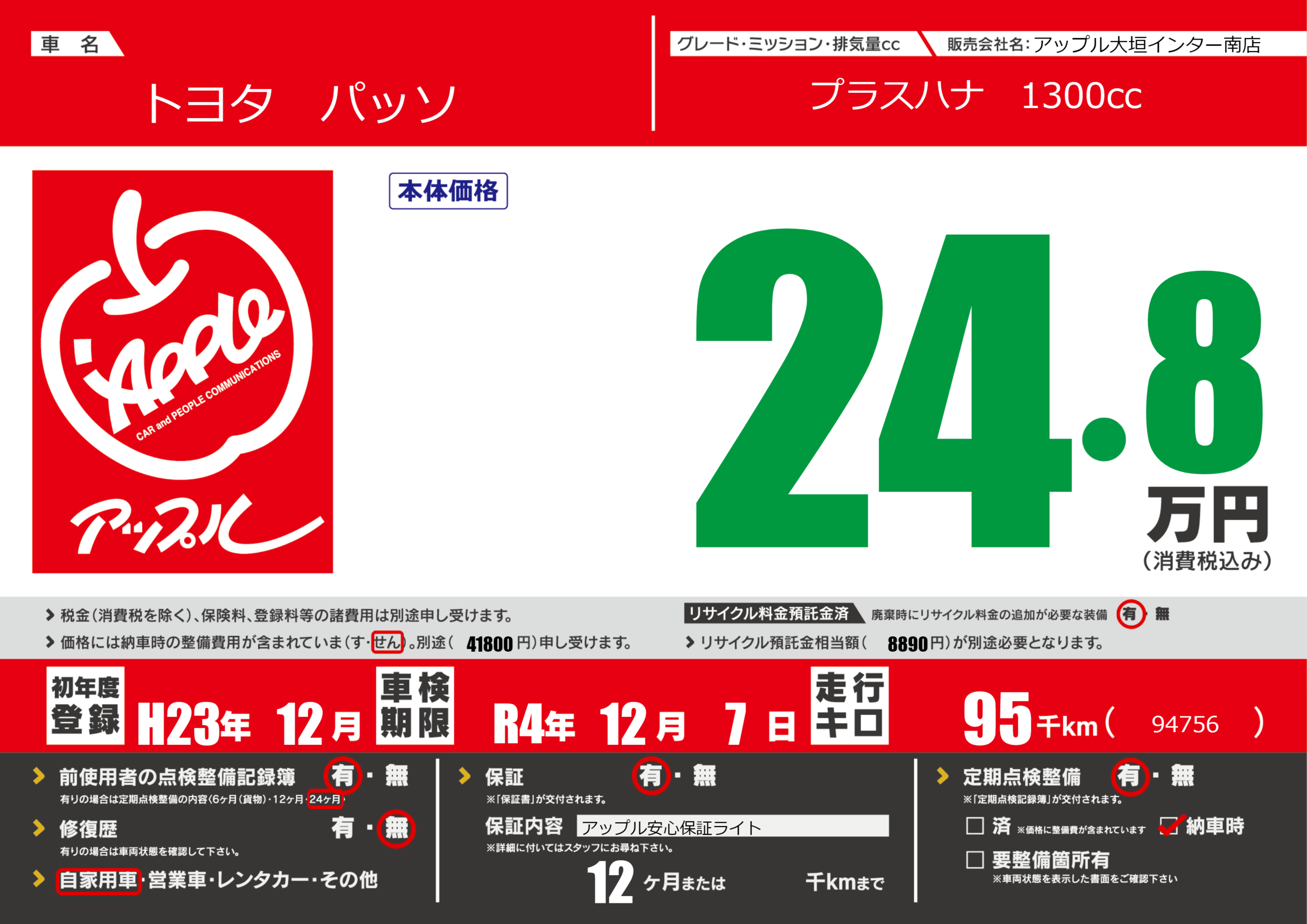 | 車名 | トヨタ パッソ | グレード ミッション 排気量 |