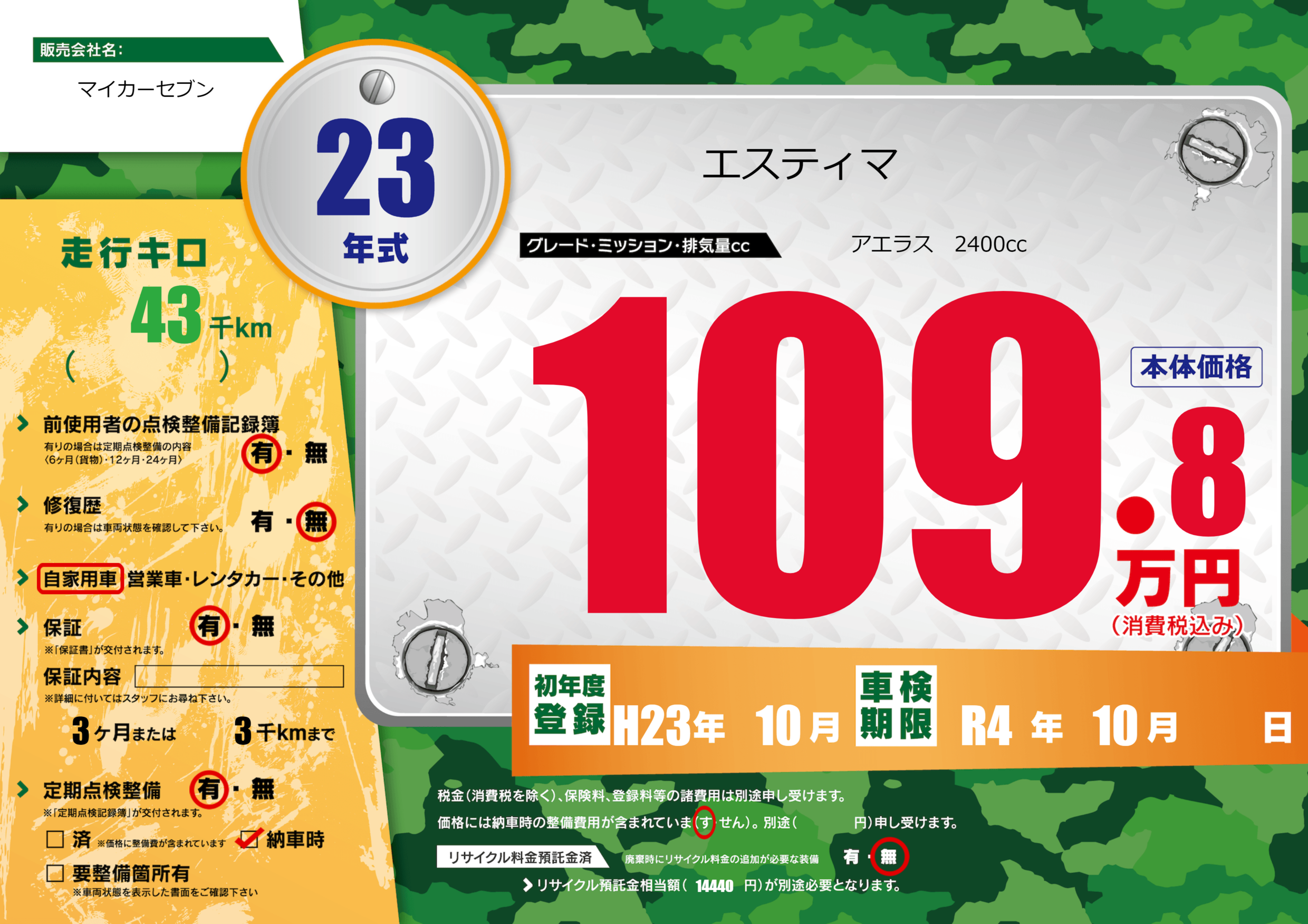 | 車検制限 | R4年 10月 - 日 | ||