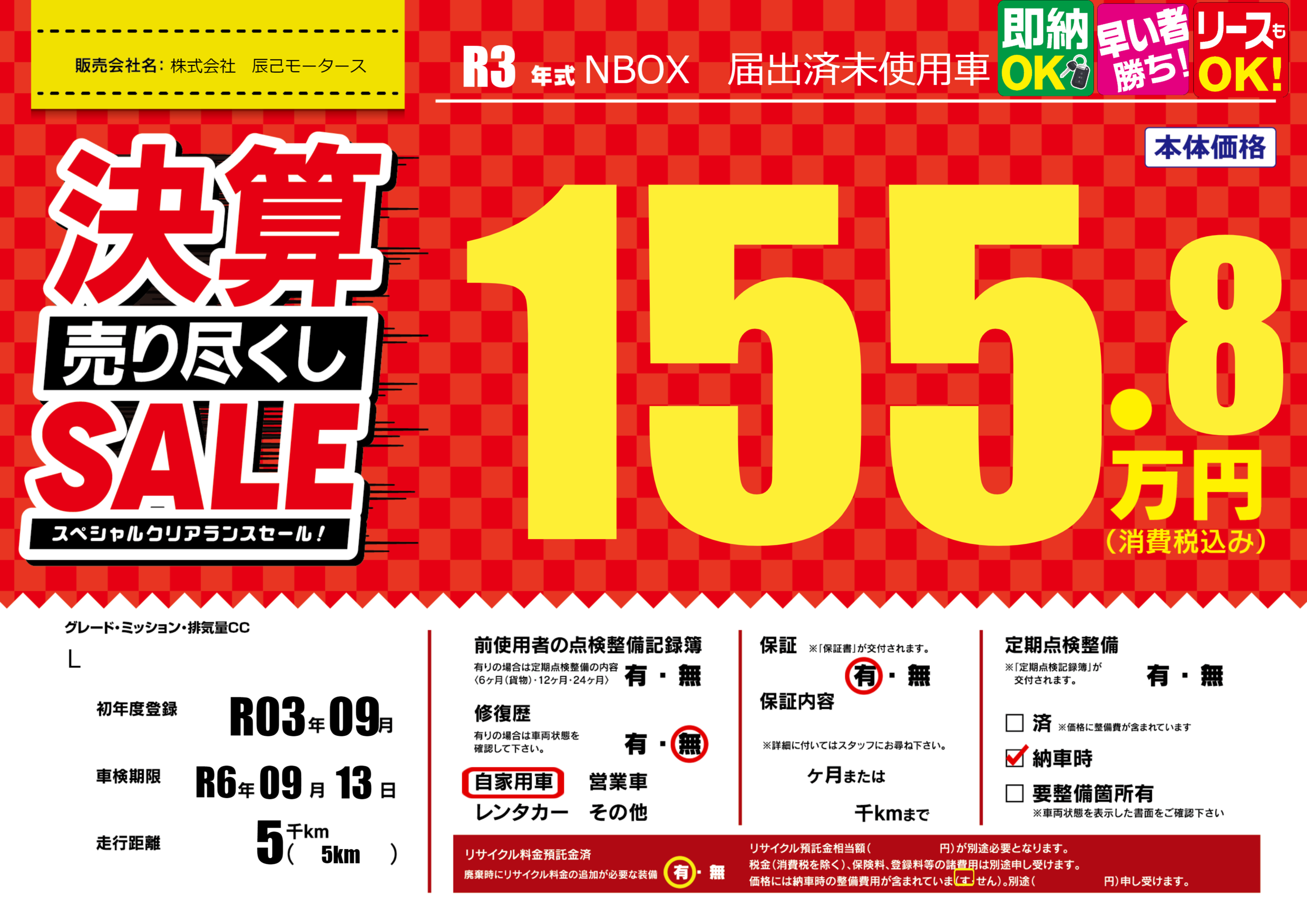| 車名 | NBOX 届出済未使用車 | グレード ミッション 排気量 |