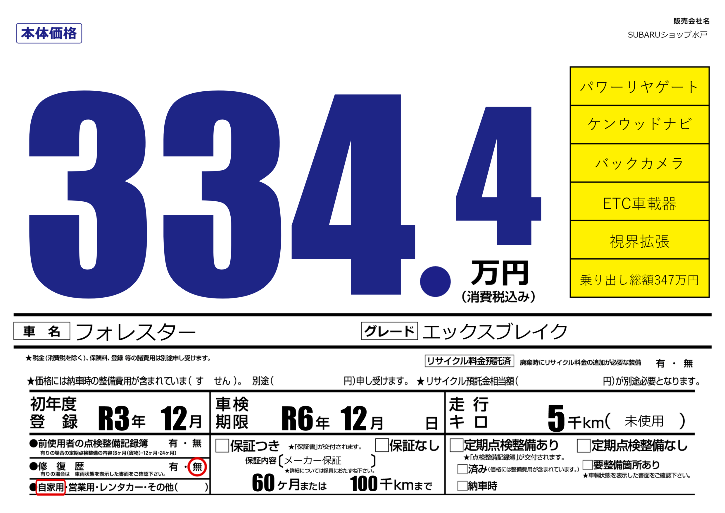 | 車名 | フォレスター | グレード ミッション 排気量 |