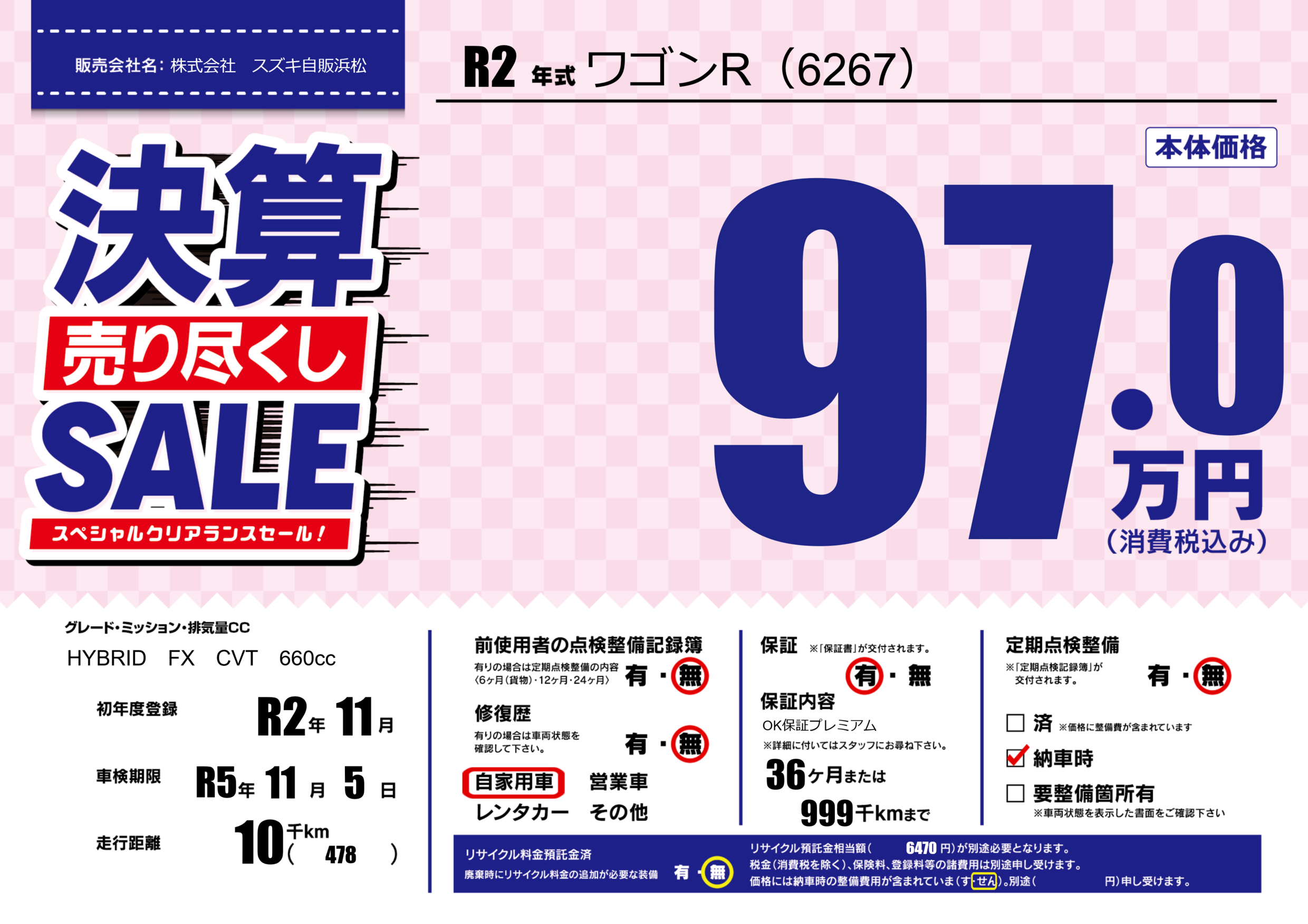 | 車名 | ワゴンR(6267) | グレード ミッション 排気量 |